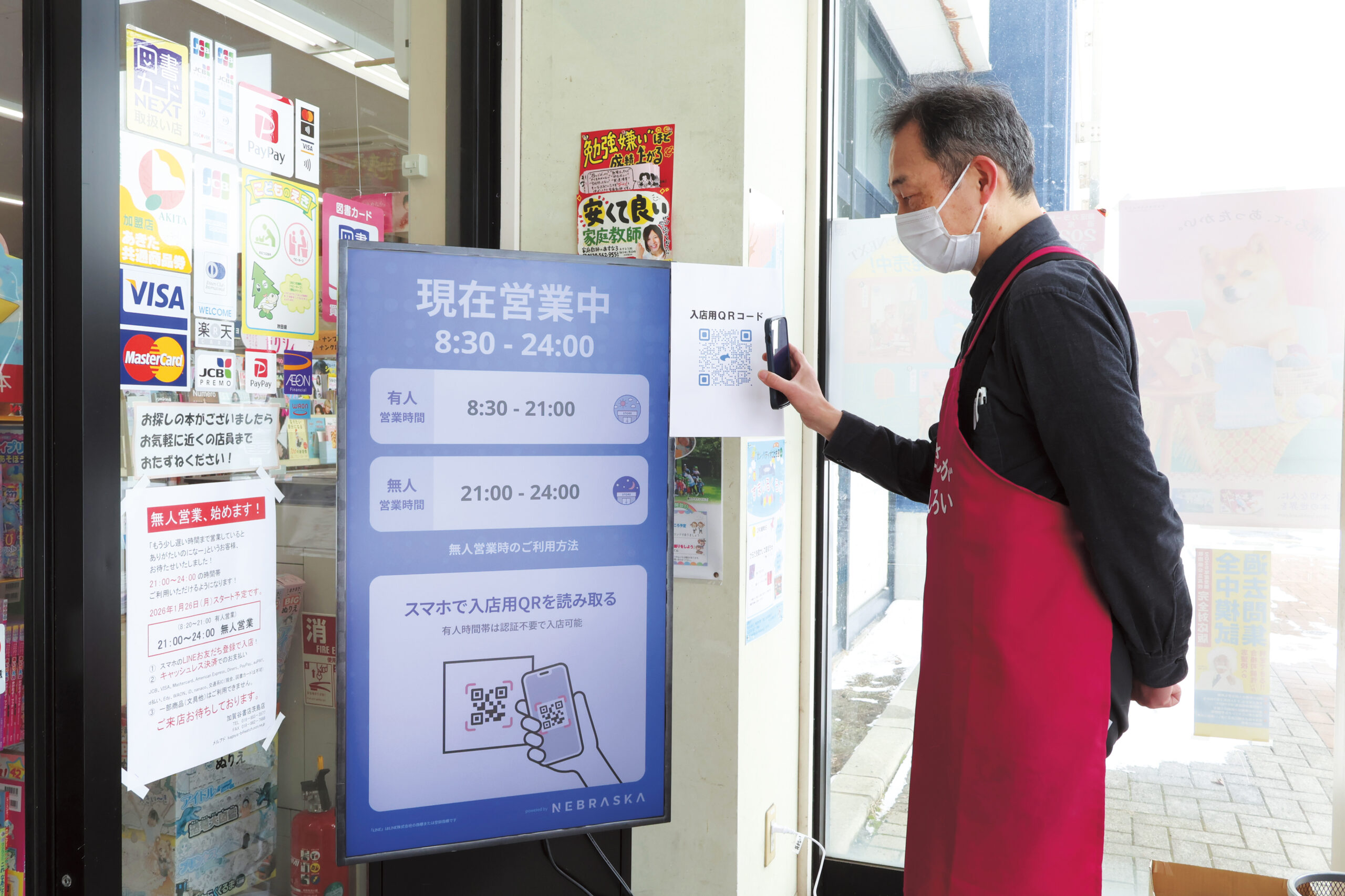 加賀谷書店 茨島店が、1月26日より県内の書店としては初の試みとなる〈無人営業〉をスタート。通常営業を終えた21時から24時までの3時間、キャッシュレスのみのセルフレジを使用する無人販売を行っている。
