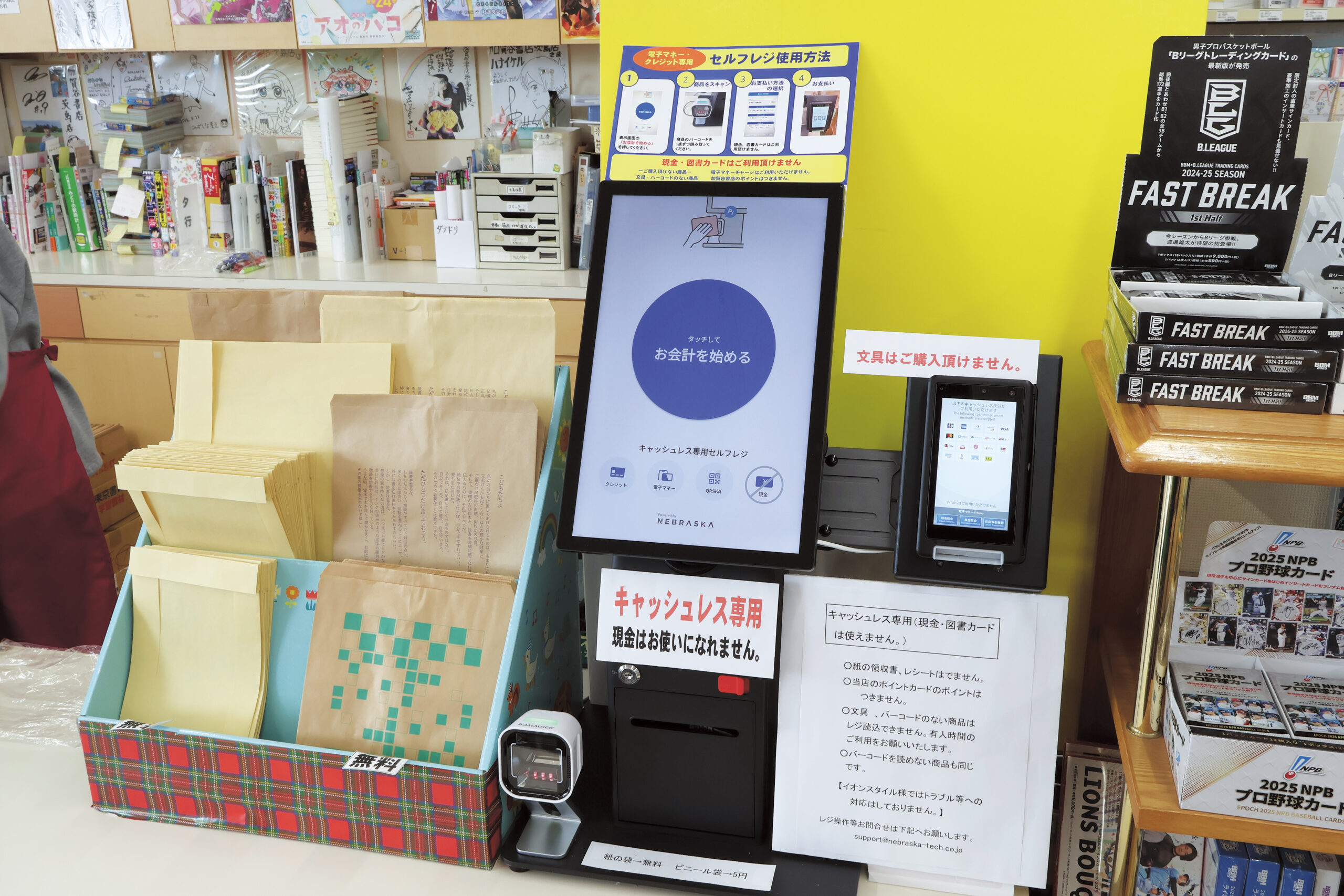 無人営業時はセルフレジのみ。図書カードも利用不可なので注意して。