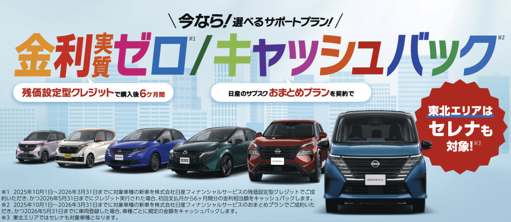 日産サティオ秋田では2026年3月末まで、対象車種の新車を購入する際に選べるサポートプランを用意。