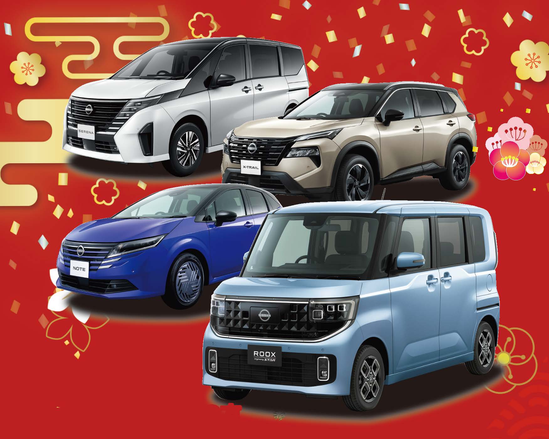 初売期間は、セレナ、ノート、エクストレイル、ルークスなど人気車種の新車ご成約で、登録月に応じて最大7万円分のオプション券をプレゼント。お得なこの機会が狙い目!