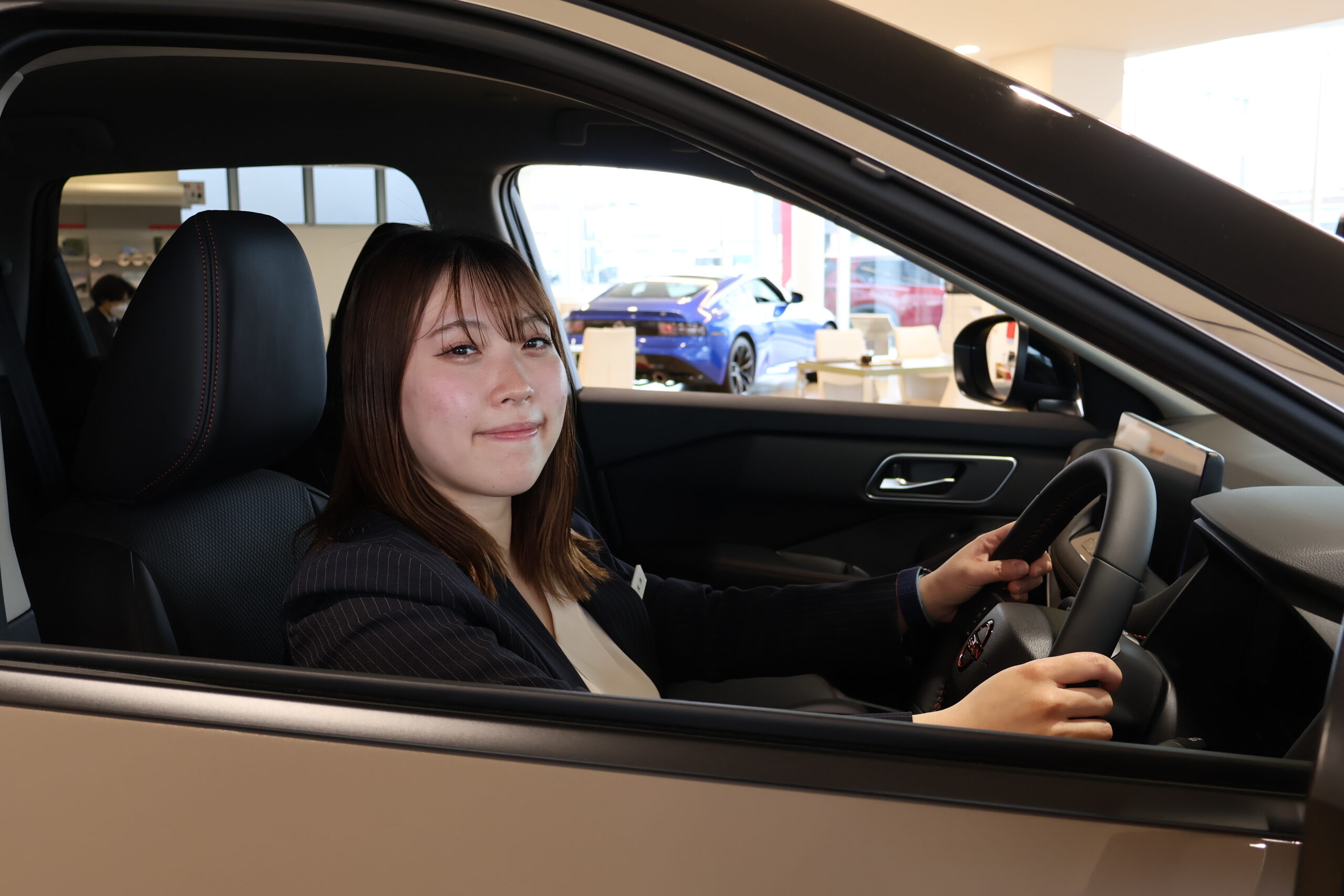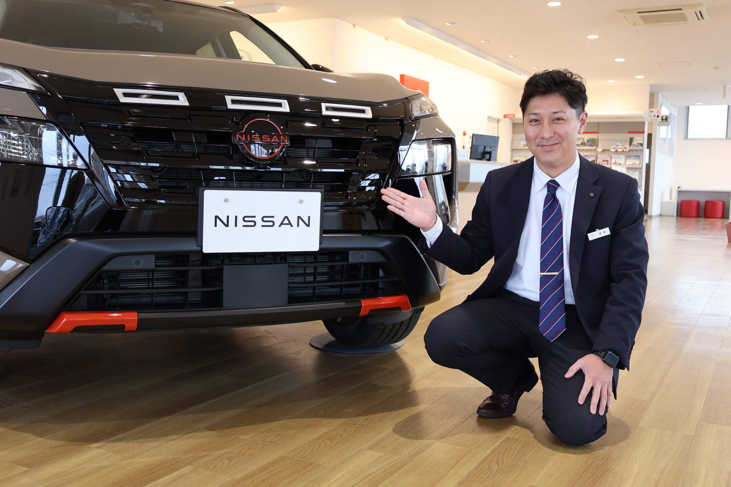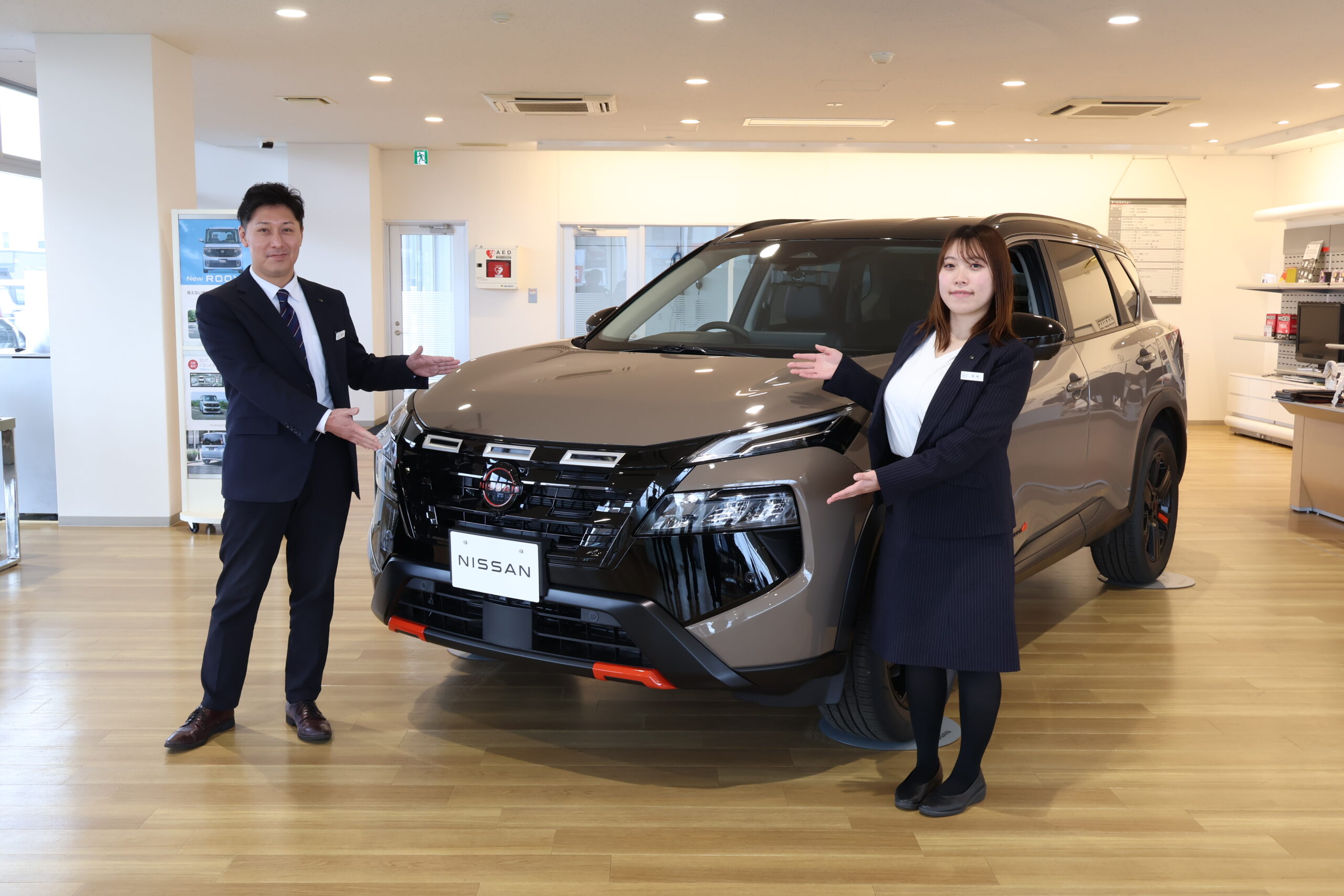 「ぜひ実車を店頭でご覧ください!」と話すのは、日産サティオ秋田 秋田店のカーライフアドバイザー・菅原さんと天内さん。