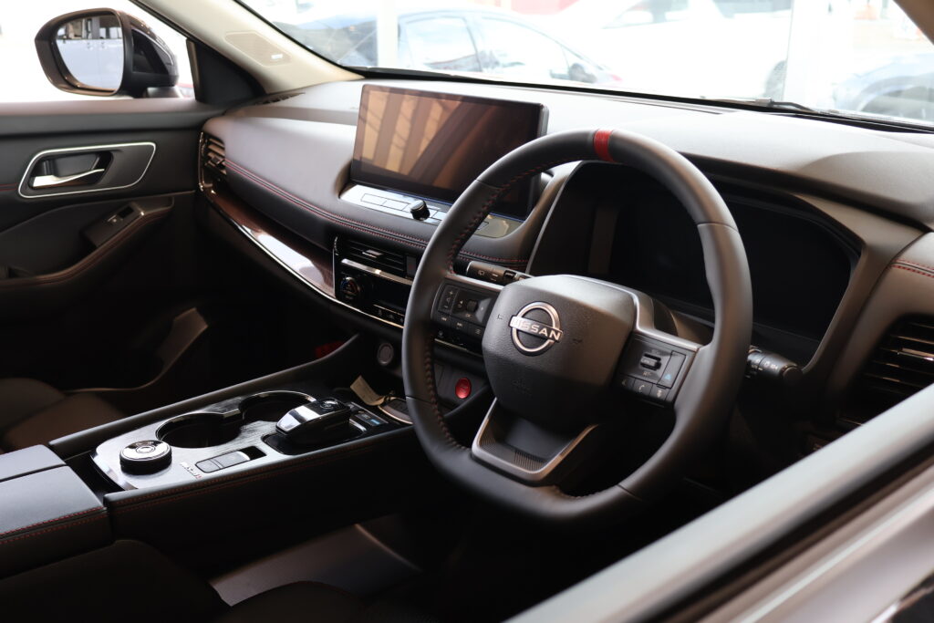 上質でありながら、⾛りへの⾼揚感を誘うスポーティな室内空間。インテリアにもNISMO専⽤パーツを採⽤した。