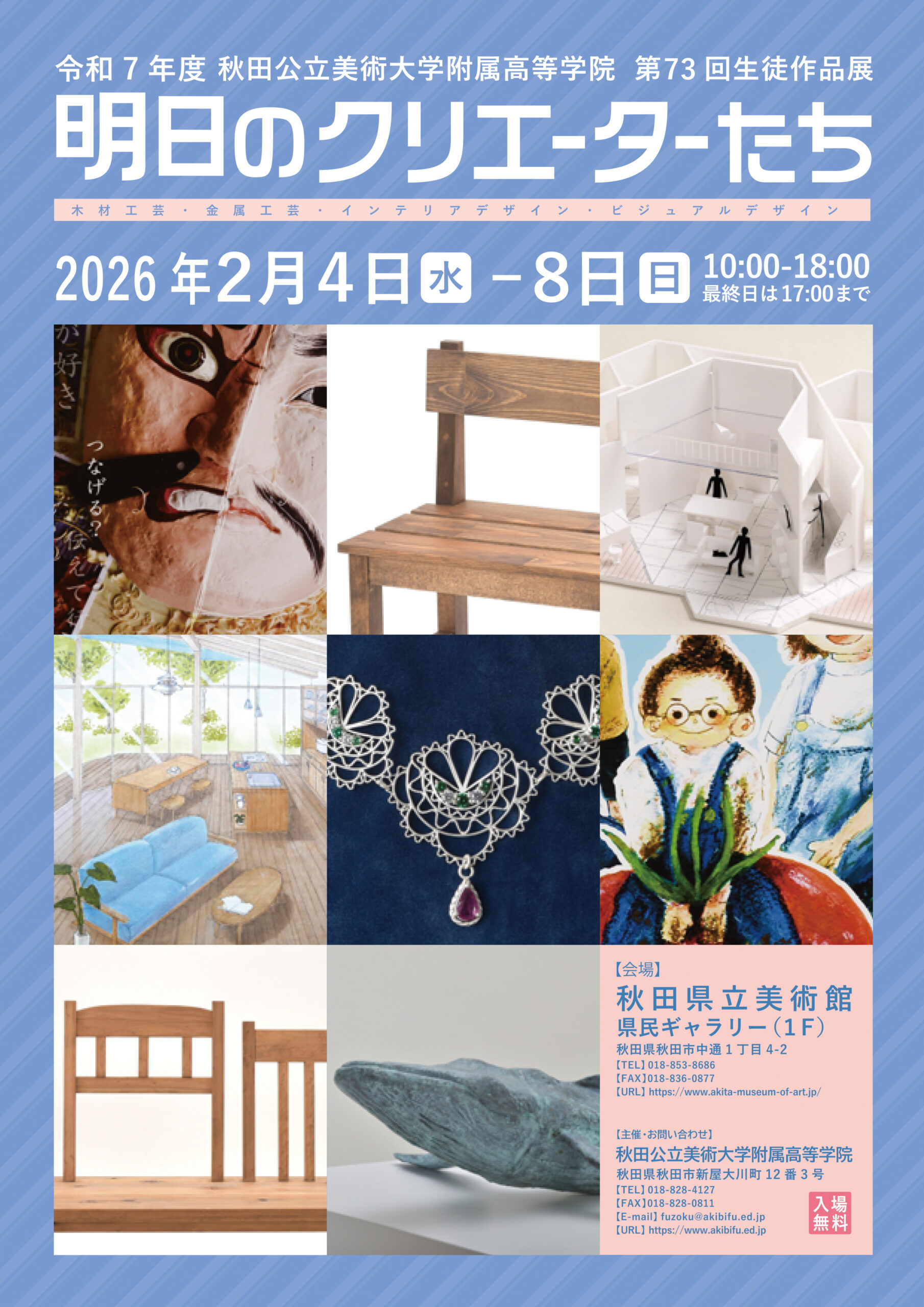 秋田公立美術大学附属高等学院の生徒による展覧会。1・2年生が日々の授業で制作した作品や、木材工芸・金属工芸・インテリアデザイン・ビジュアルデザインの各コースに分かれて学んだ3年生の集大成となる卒業制作作品などが並ぶ。一人ひとりの個性が輝く展示は必見!