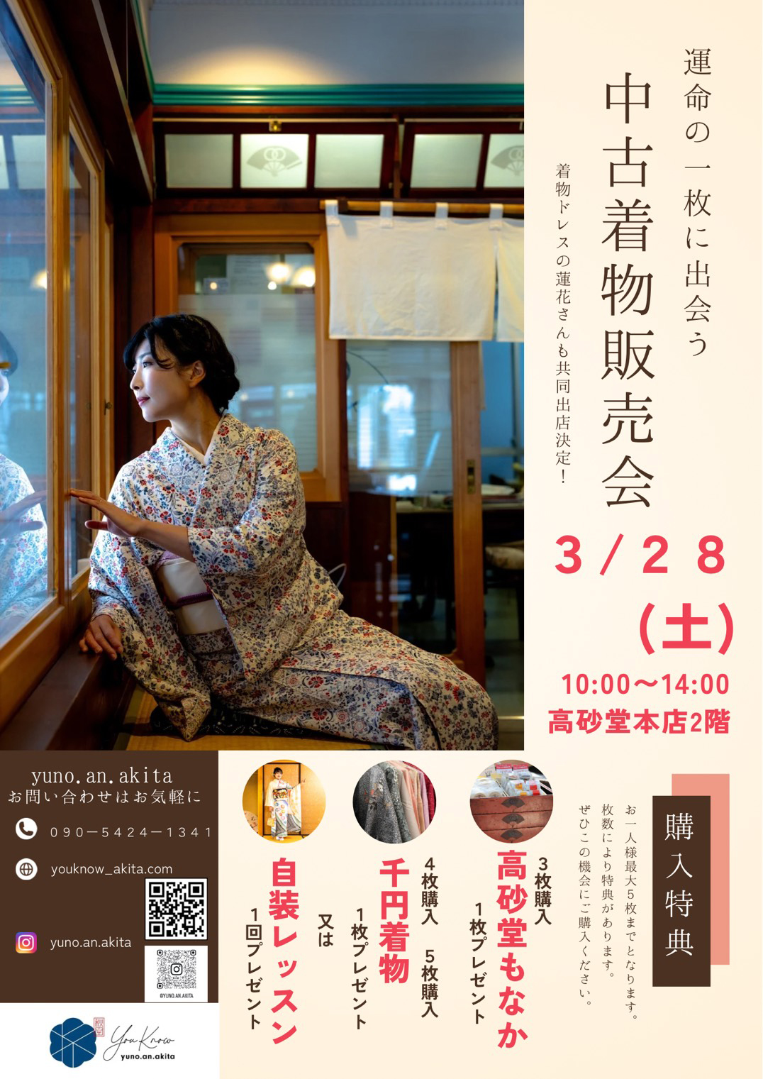 秋田市通町にある高砂堂本店で、大町にお店を構える「着付蓮花」と合同の中古着物の販売会が行われる。着物は一人5枚まで購入可能。購入した枚数ごとに特典があり、中古着物3枚購入で高砂堂もなか1個プレゼント、中古着物4枚・5枚購入で千円着物1枚プレゼントまたは、自装レッスン1回プレゼント。袖を通したくなるような運命の一枚が見つかるかも。