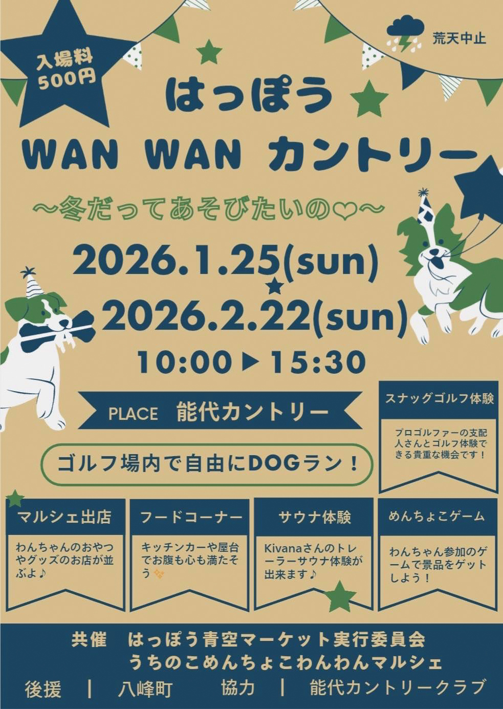 わんちゃんと一緒に楽しめるイベント。ゴルフ場を自由に散歩したり、駆けまわったりして過ごせます。人見知りのわんちゃんも自分のペースで参加できますよ。犬用おやつや飲食ブースも充実し、ゲームやサウナ、プロ直伝のスナッグゴルフ体験など、冬ならではの楽しみも満載!