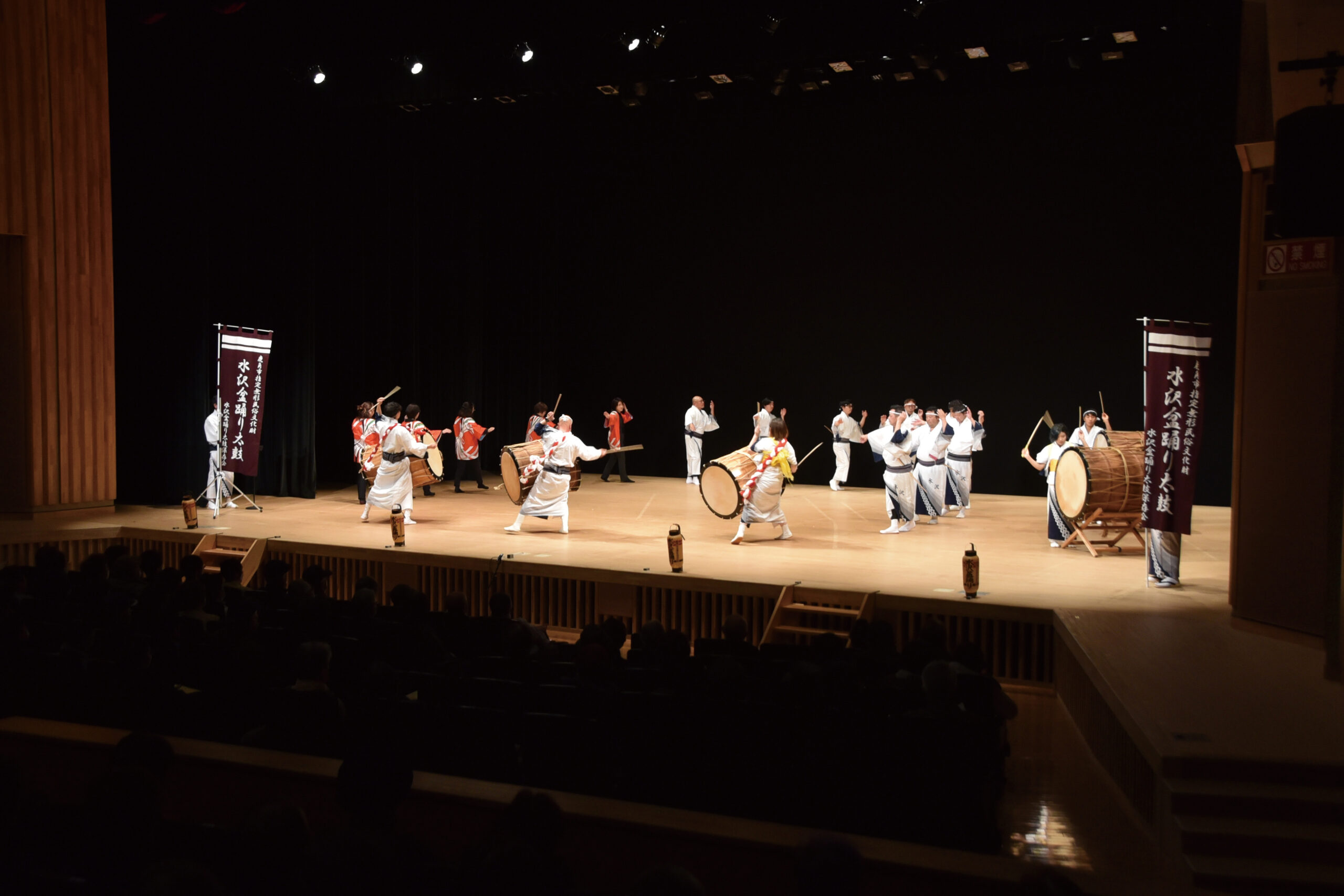 華やかな舞台で披露される、力強い「水沢盆踊り太鼓」は必見!