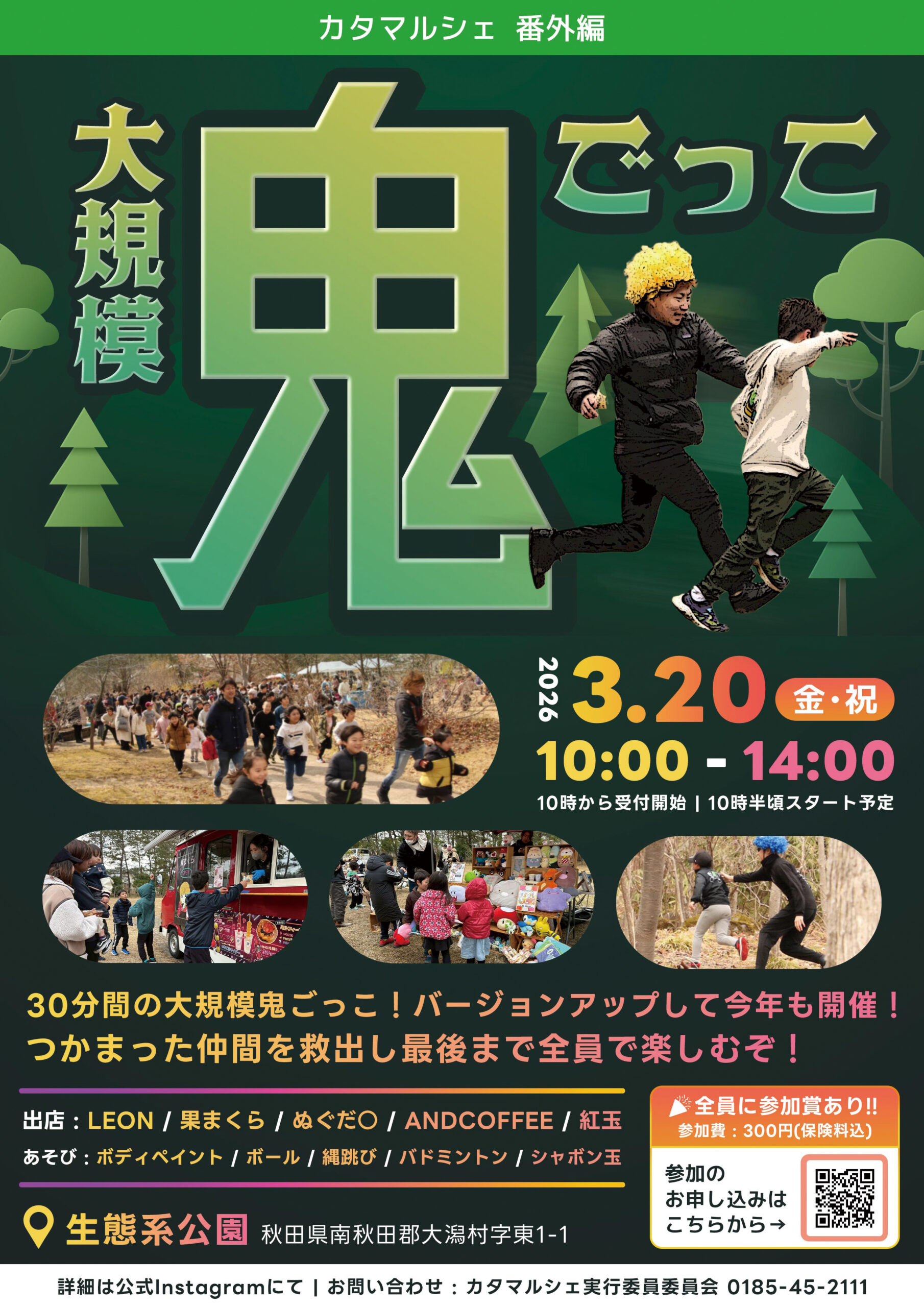 大潟村生態系公園にて、約200人の子どもたちが駆け回る鬼ごっこイベントを開催します。3回目を迎える今回はさらにパワーアップ。ミッションに挑み、捕まった仲間を救出しながら全員で楽しめます。会場ではリユース子ども服の販売や、軽食・お弁当の出店もありますよ。
