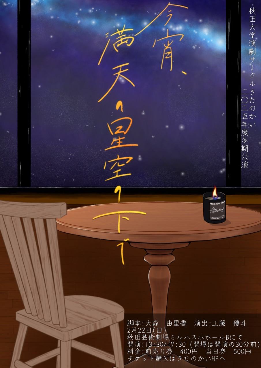 秋田大学の演劇サークル「きたのかい」が冬期公演を行う。ストーリーは、おなかも心も満たしてくれる魔法のようなレストラン「ポラリス」が舞台。おいしい料理と癒やしの時間で、あなたに元気を届けるという…。寒さが続くこの時期にぴったりの心温まるストーリーをぜひ。