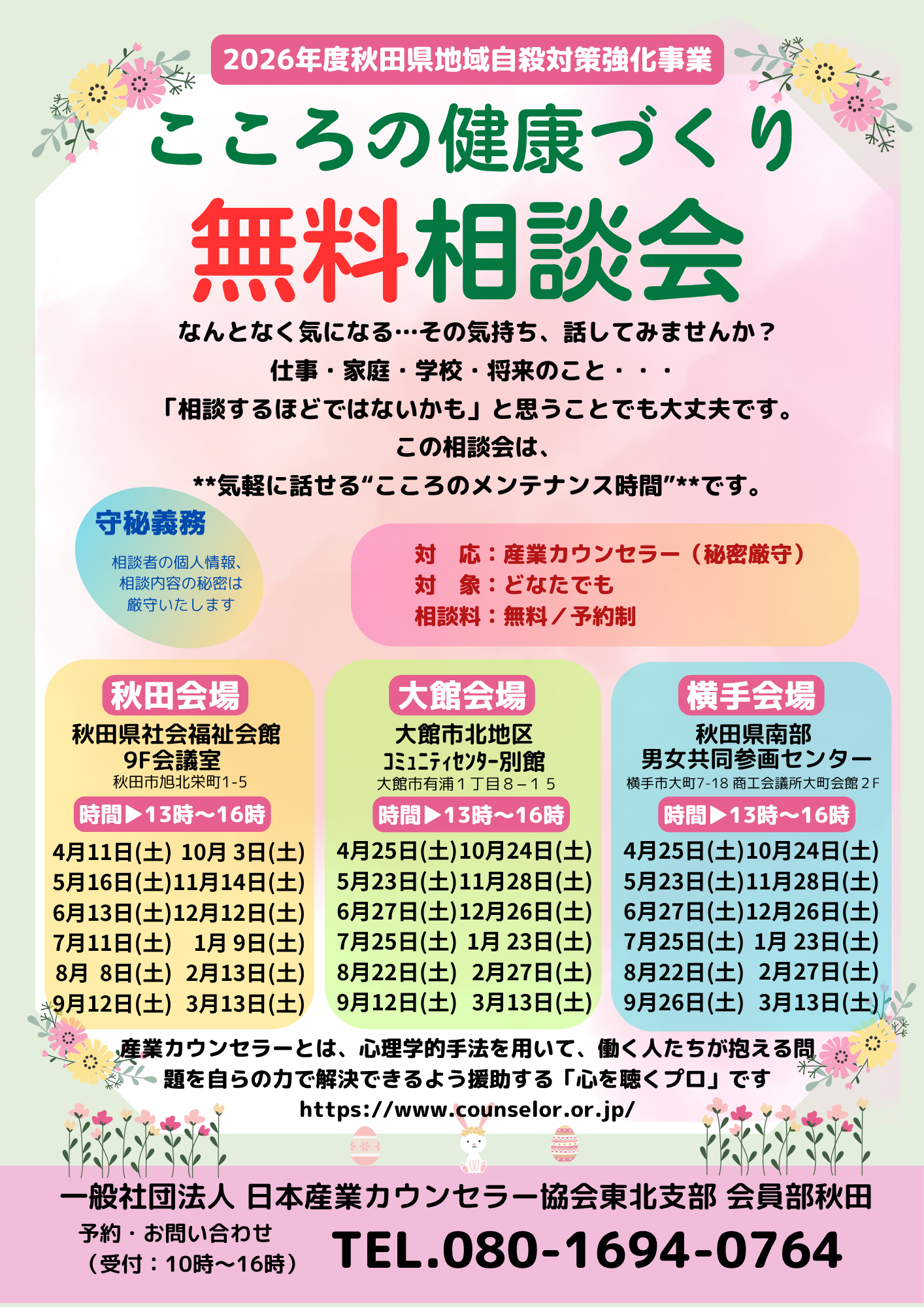 秋田県地域自殺対策強化事業で行われている、「こころの健康づくり無料相談会」。毎月1回、県内の3会場で開催され、仕事や家庭、学校、将来についてなどあらゆる悩み事を気軽に相談できる。誰でも参加でき、相談料は無料(予約制)。”こころのメンテナンス”となるこの機会を、ぜひ活用してみて。