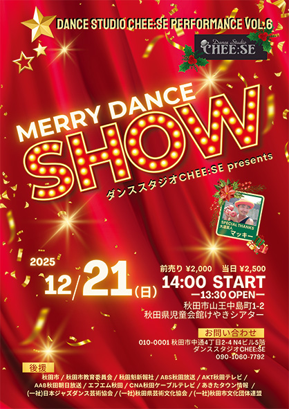 スタジオ設立10年目に突入した「ダンススタジオCHEE:SE」が、ジャズダンスを中心に、クリスマスにピッタリのステージを届ける。第1部には大道芸人のマッキーを、第2部には秋田バトンクラブをゲストに迎え、第3部ではコンクール作品を中心に披露。笑顔あふれるステージを楽しんで。