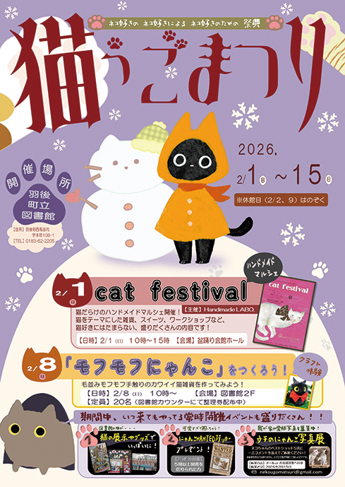 図書館内が猫一色に染まる、猫好きのためのイベントが今年も開催! 2月1日(日)10:00 〜15:00 に行う猫だらけのハンドメイドマルシェ「catfestival」には、猫をモチーフにした雑貨やスイーツが集まります。猫を題材にした作品展示やグッズがたくさんの2週間をお見逃しなく。