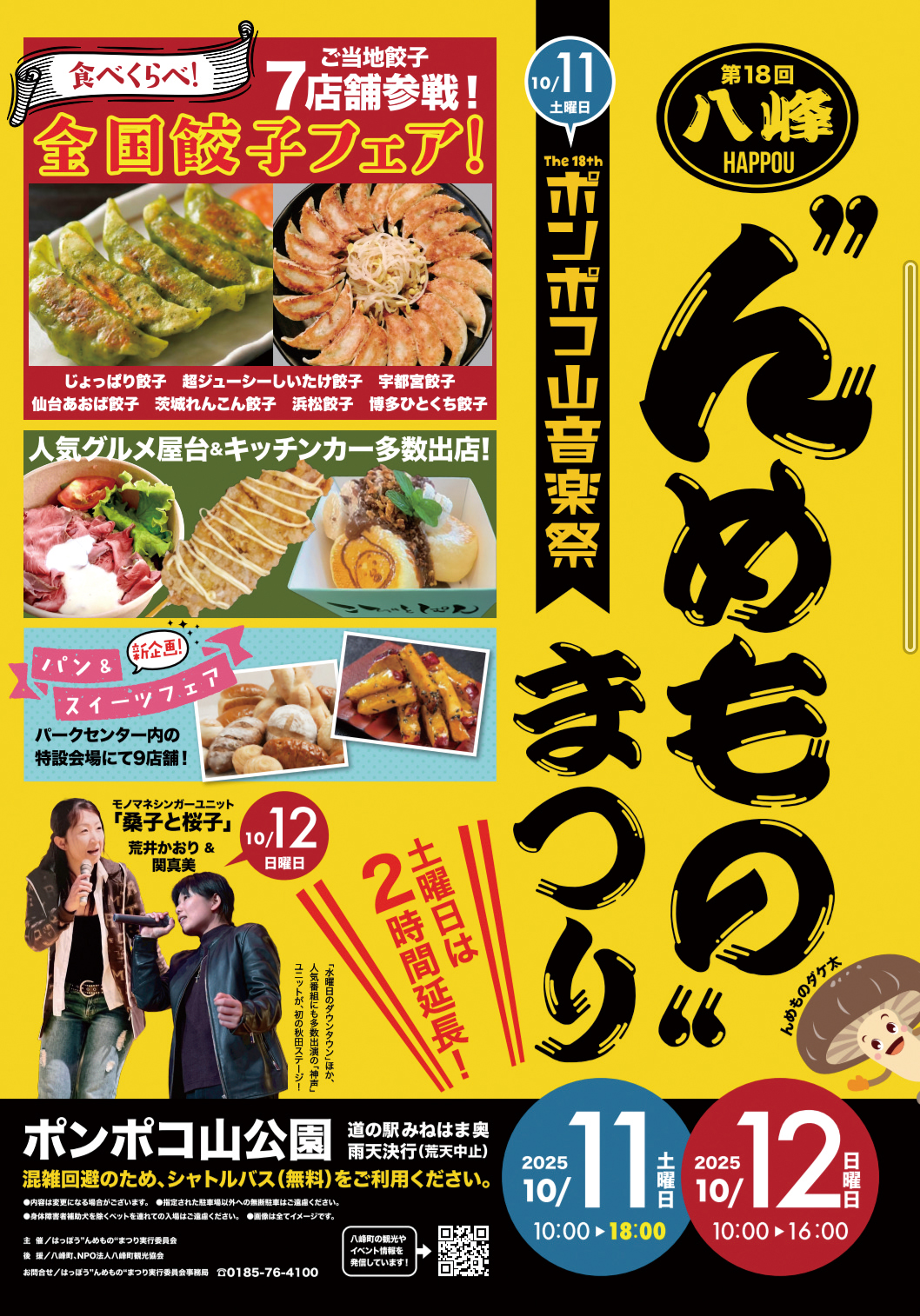 海と山の恵みが集まる「八峰“んめもの”まつり」が、今年も開催されます! 会場では、7店舗のご当地餃子を食べ比べできる「全国餃子フェア」や、人気のグルメ屋台&キッチンカーが勢揃い。さらに、10月11日(土)には、多彩なアーティストによるステージパフォーマンスが楽しめる「ポンポコ山音楽祭」も開催。美味しいグルメと音楽でにぎわうイベントに、家族や友人とぜひお出かけください。会場までは無料シャトルバスも運行しますので、気軽にご利用いただけます。