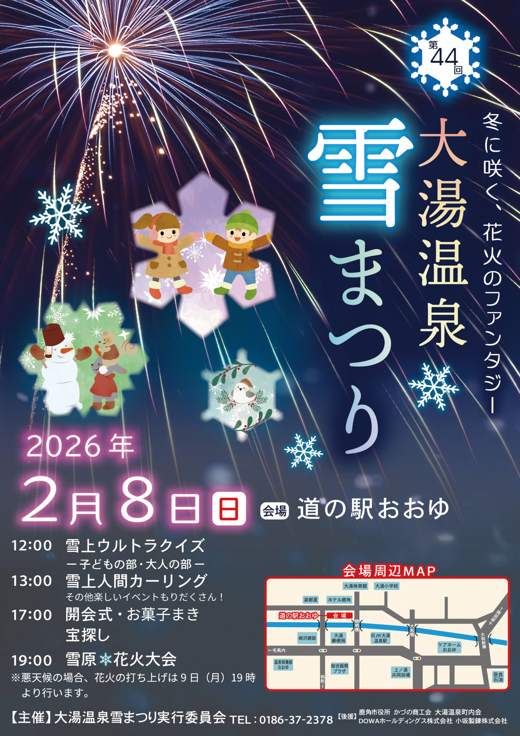 毎年恒例の「大湯温泉郷」の冬祭りが、今年も開催されます。雪上ウルトラクイズや冬ならではの人間カーリング、何がもらえるかはお楽しみの宝探しなど、子どもから大人まで楽しめるイベントが盛りだくさん。祭りのフィナーレを飾る、冬の夜空を彩る打ち上げ花火は必見です。