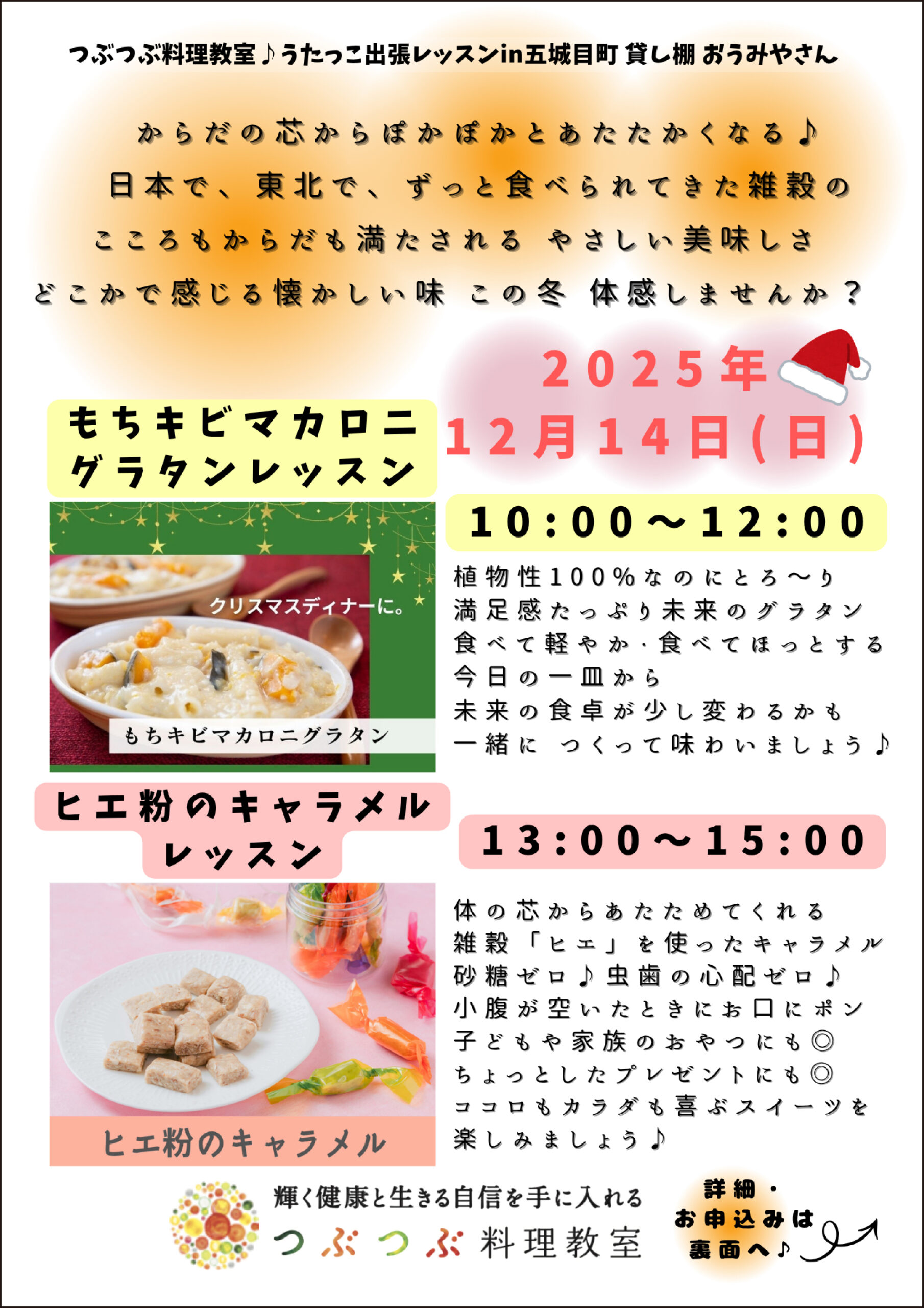 | 開催日時 | 12月14日 (日) 10:00〜12:00(もちキビマカロニグラタン)、 13:00〜15:00(ヒエ粉のキャラメル) |
