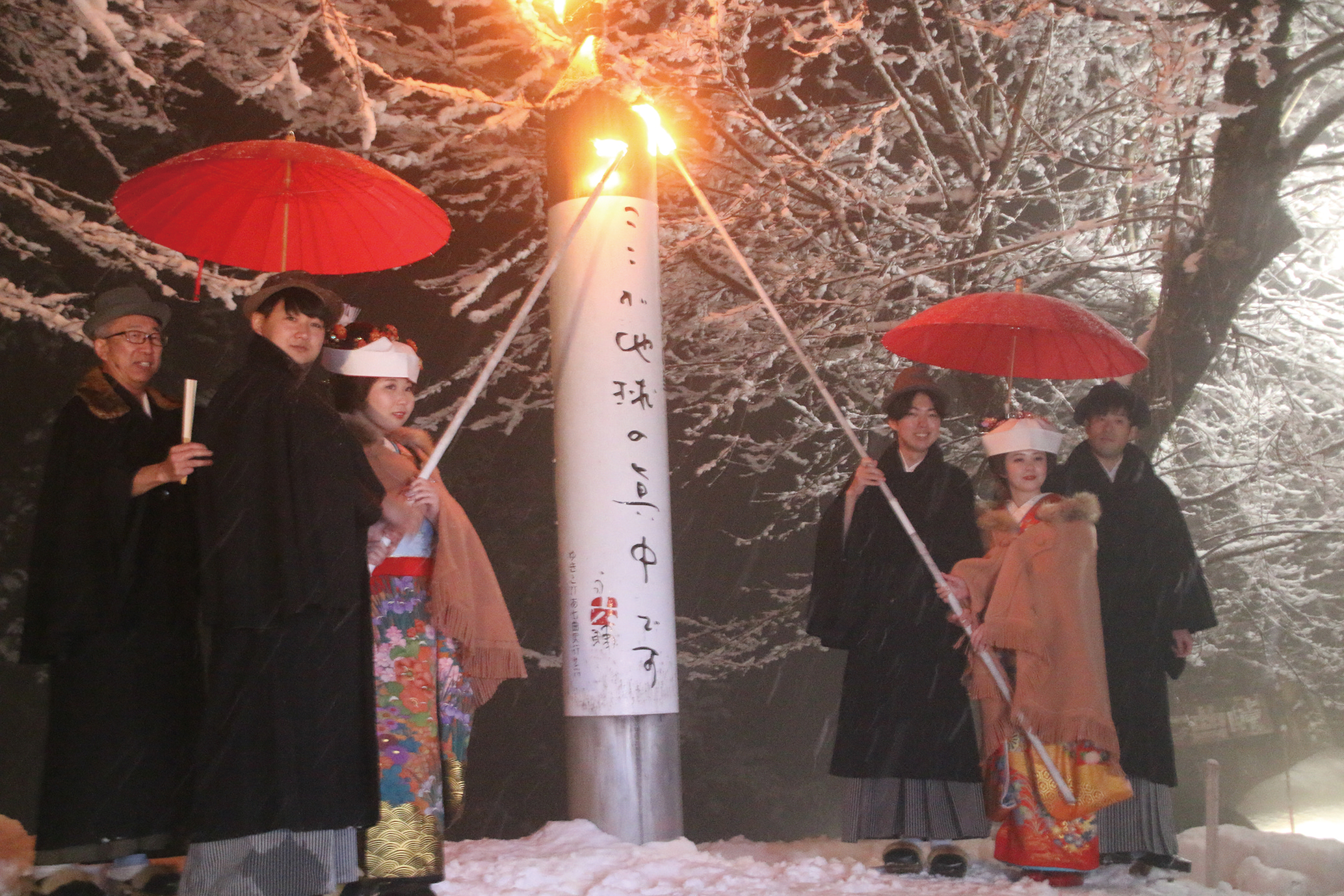 昭和30年代の様式を再現し、和装の新郎新婦を馬そりに乗せて歩く花嫁道中。あぐりこ神社やかがり火広場、雪まつり会場などを巡りながら旧長谷山邸を目指します。「七曲峠」の雪の壁に連なるキャンドルロードも見どころ。最後の祝賀会では、大輪の花火が打ち上げられます。