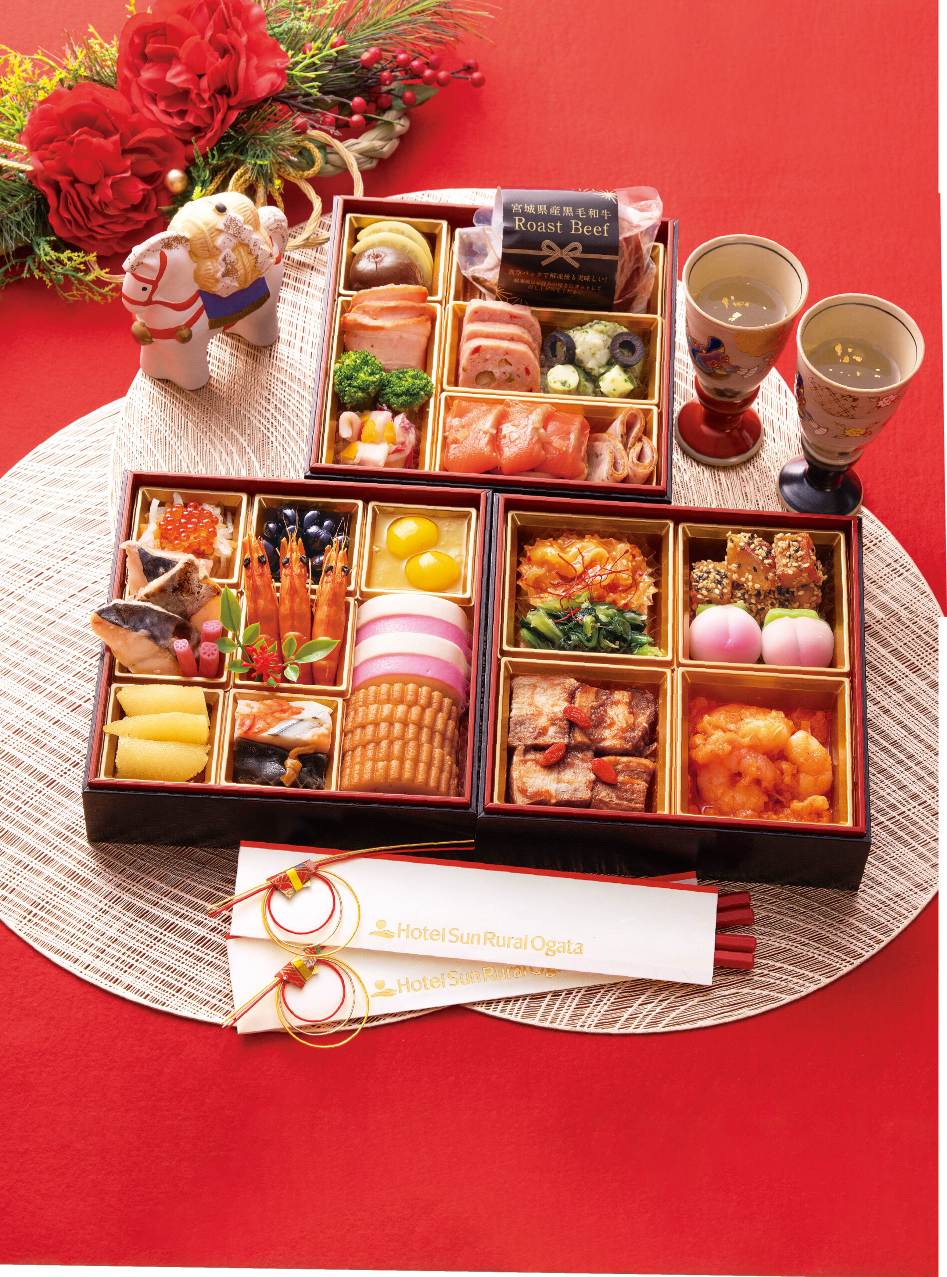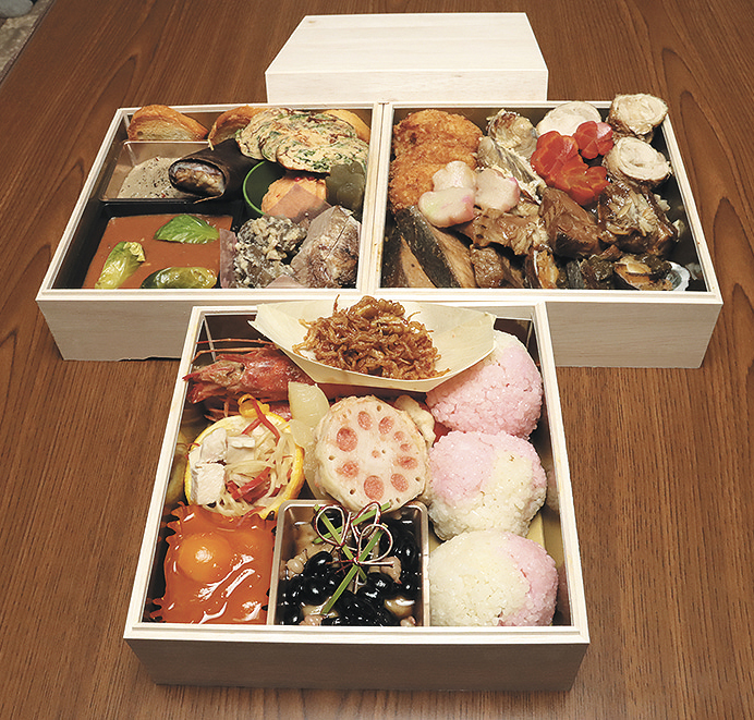 同ホテルの総料理長が監修した特製おせちが今年も数量限定で登場。〈和の重〉、〈洋の重〉、〈中の重〉の三段重には、熟練の技が光る逸品が詰まっている。新年を彩る華やかな料理を一度に楽しもう。