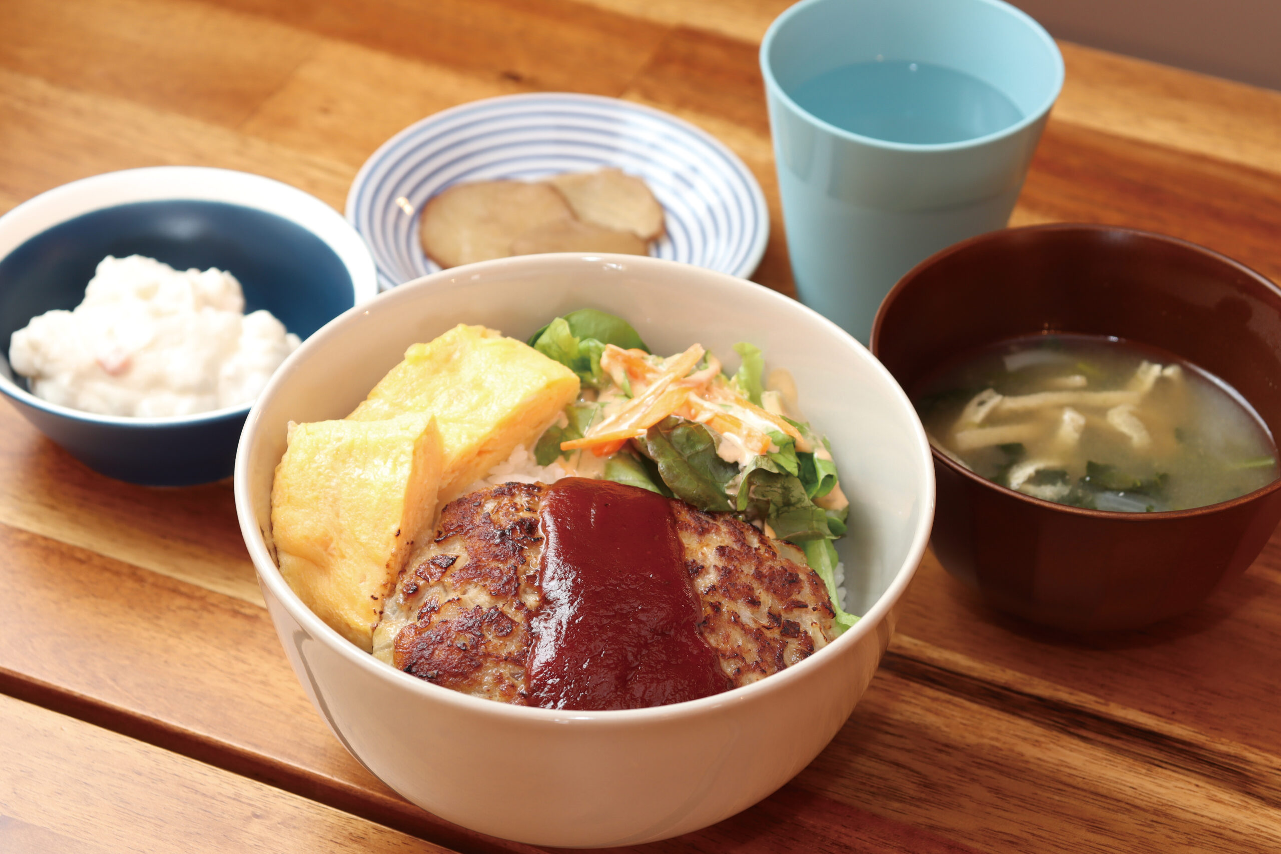 (トップ)日替わりの「ランチセット」900円。肉料理がメインで、取材時はハンバーグ丼が登場。