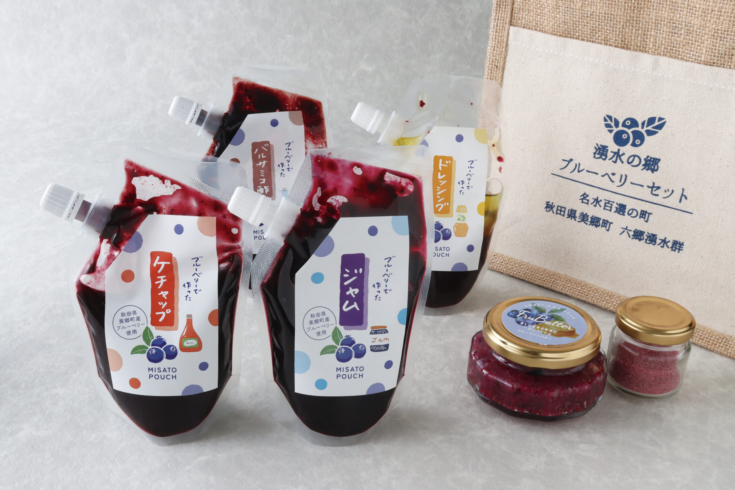美郷町産ブルーベリーをふんだんに使った「湧水の郷 ブルーベリーセット」が新登場! 同町内の「ミサトマルシェ」が「ブルーベリー農家で余った果実を生かしたい」という思いで手掛けた。ジャム・バルサミコ酢・ケチャップ・ドレッシングの「MISATO POUCH( ミサトパウチ)」4種類に加え、「ブルーベリーバター」と「ソルトブルーベリー」を詰め合わせた6点セット。お土産としてもオススメ。