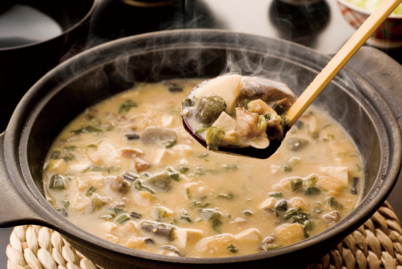 寒い季節に、古くから地元で親しまれている納豆汁はいかがでしょうか? すり潰した納豆と味噌、キノコや山菜を使用した伝統的な家庭料理です。具材や調理方法、納豆のすり方は家庭やお店によりさまざま。美味しい料理でからだをポカポカにして、冬の寒さを乗り切りましょう!
