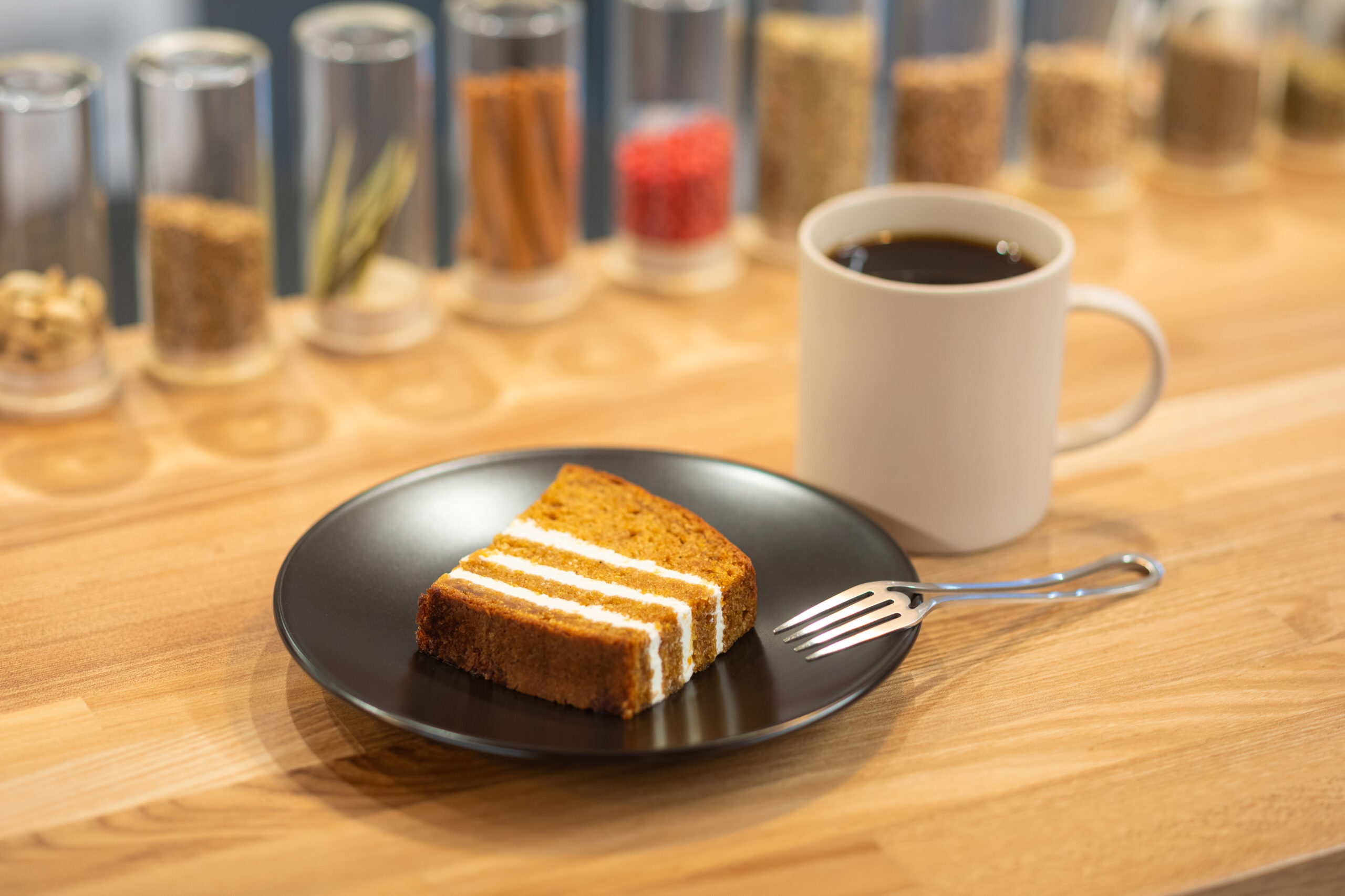 ニンジンとスパイスの風味が楽しめる「キャロットケーキ」500円と「Premium Grade」800円(取材時はエチオピア・グジ・ジゲサ・G1)。