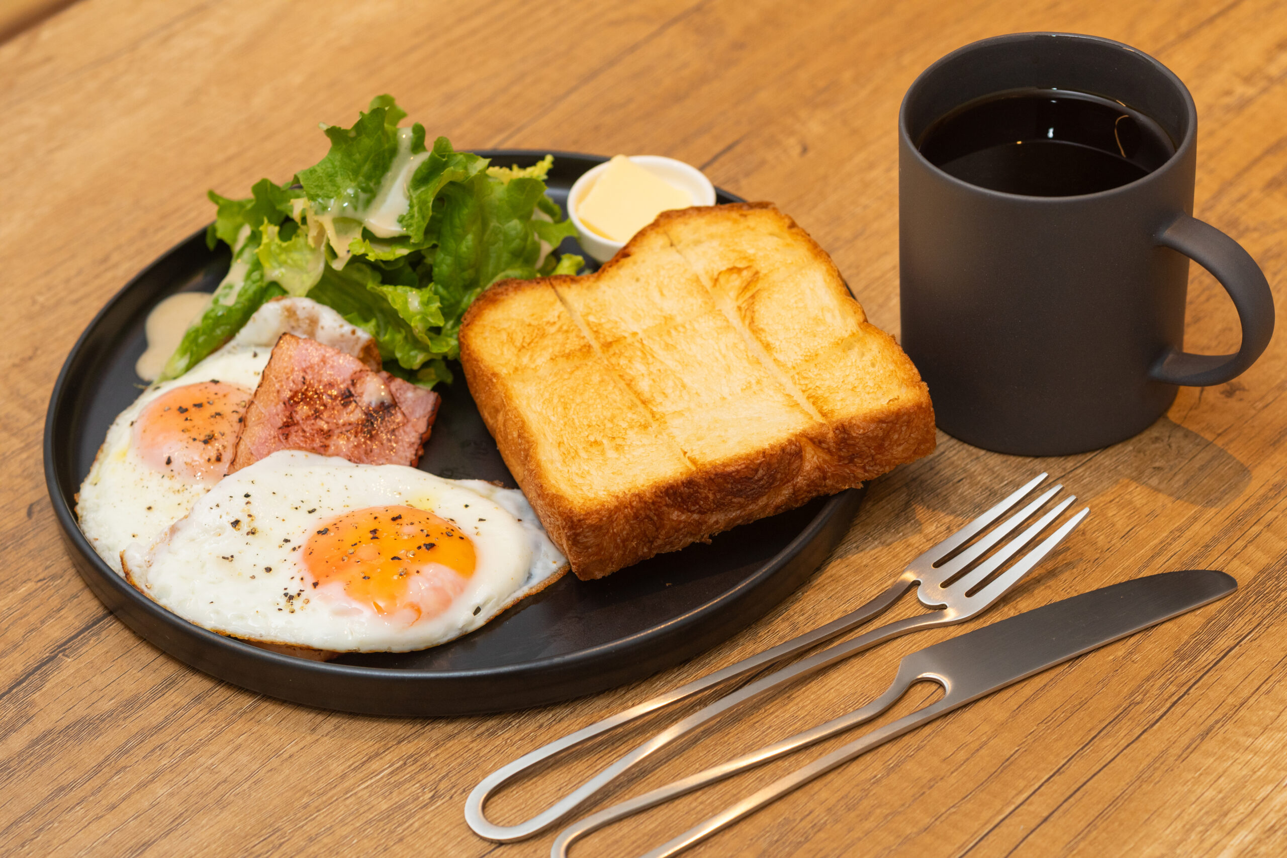 10:00〜11:00に提供する「SunnySide UP!」1,100円はトースト・目玉焼き・厚切りベーコン・サラダ・ドリンクがセットに。