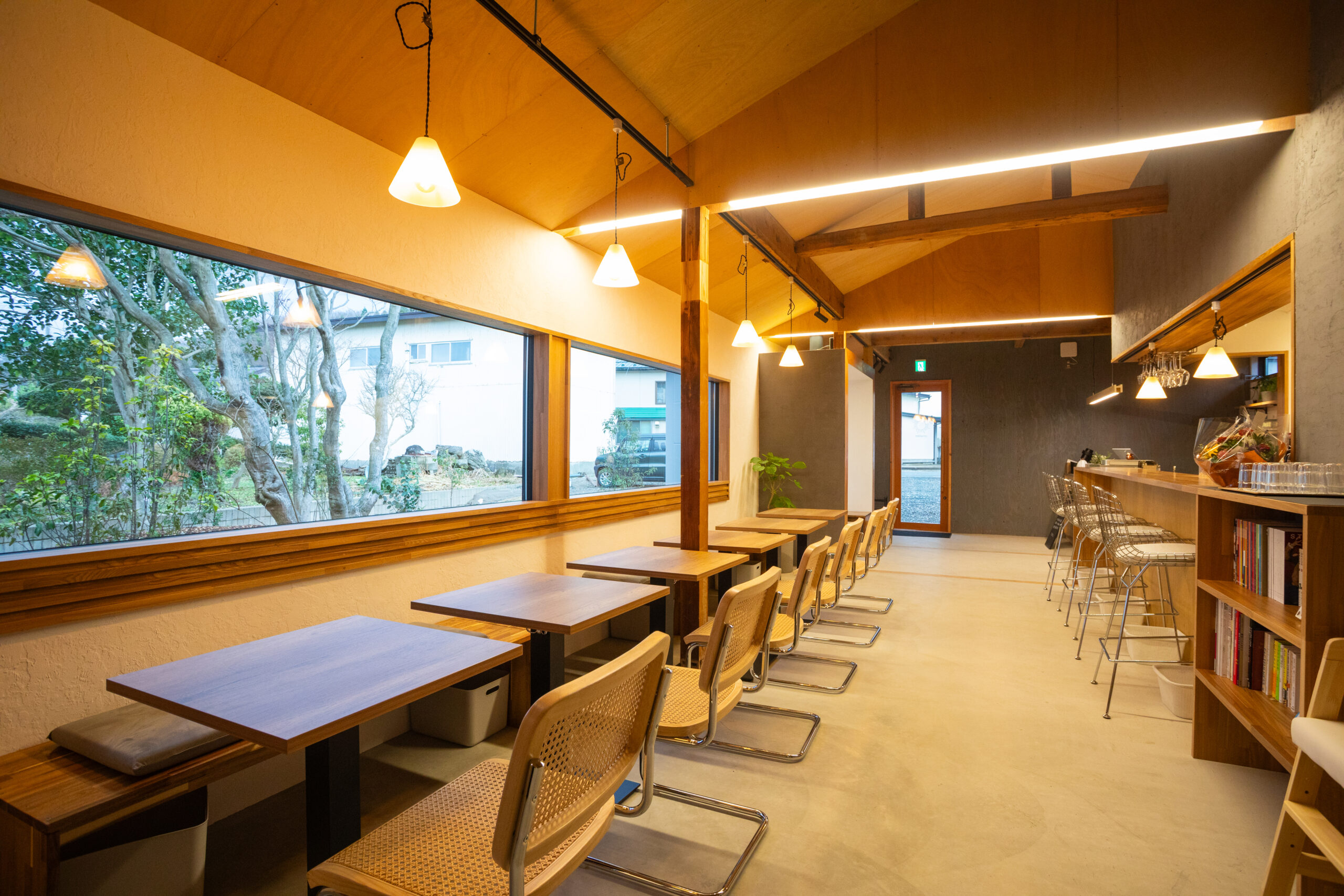 (トップ)中庭を眺められる大きなFIX窓が印象的な店内。