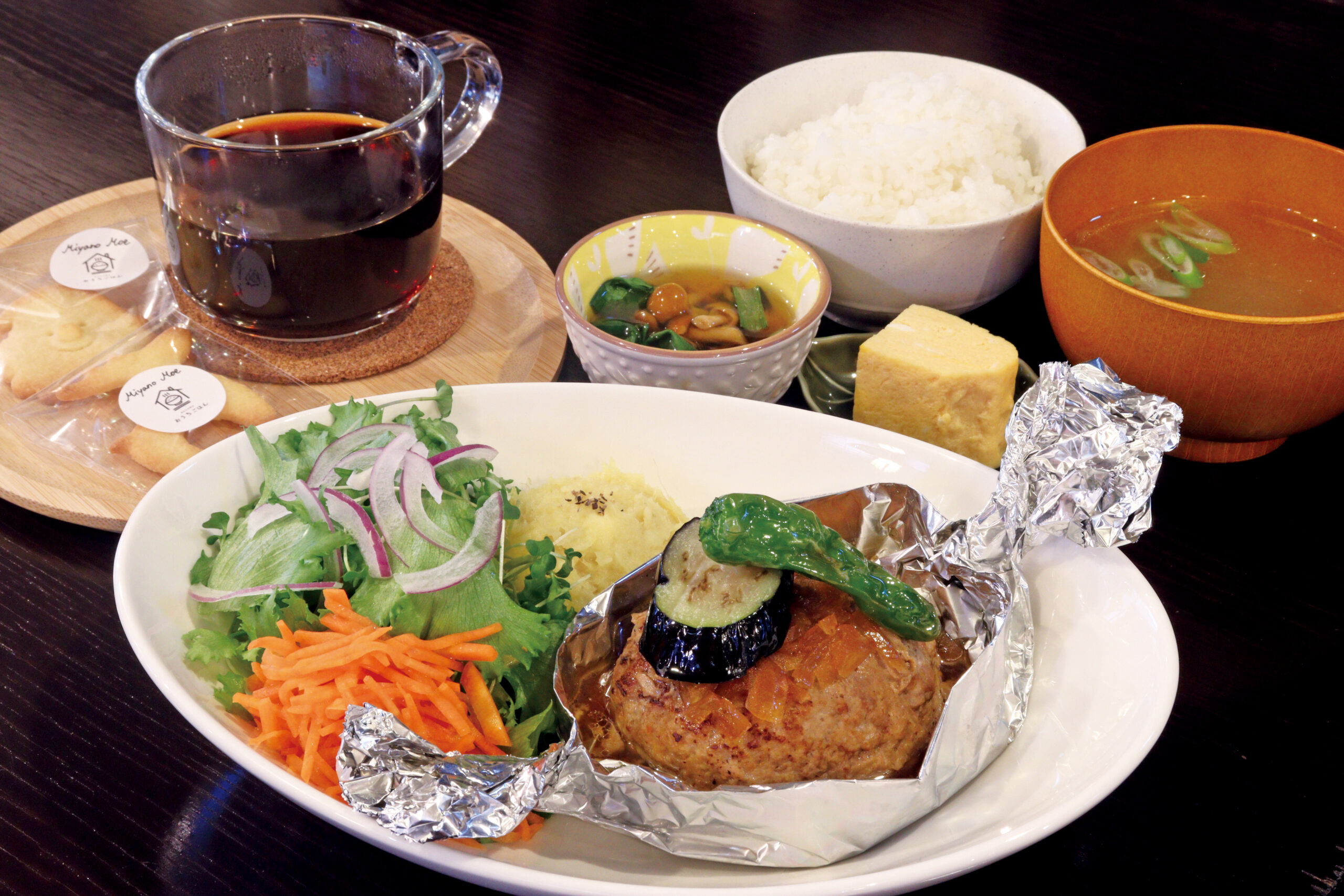 (トップ)取材時は蒸し焼きでふっくら仕上げた「ハンバーグ定食」1,500円(ドリンク付き)が登場。この日はサービスでクッキーが付いた。