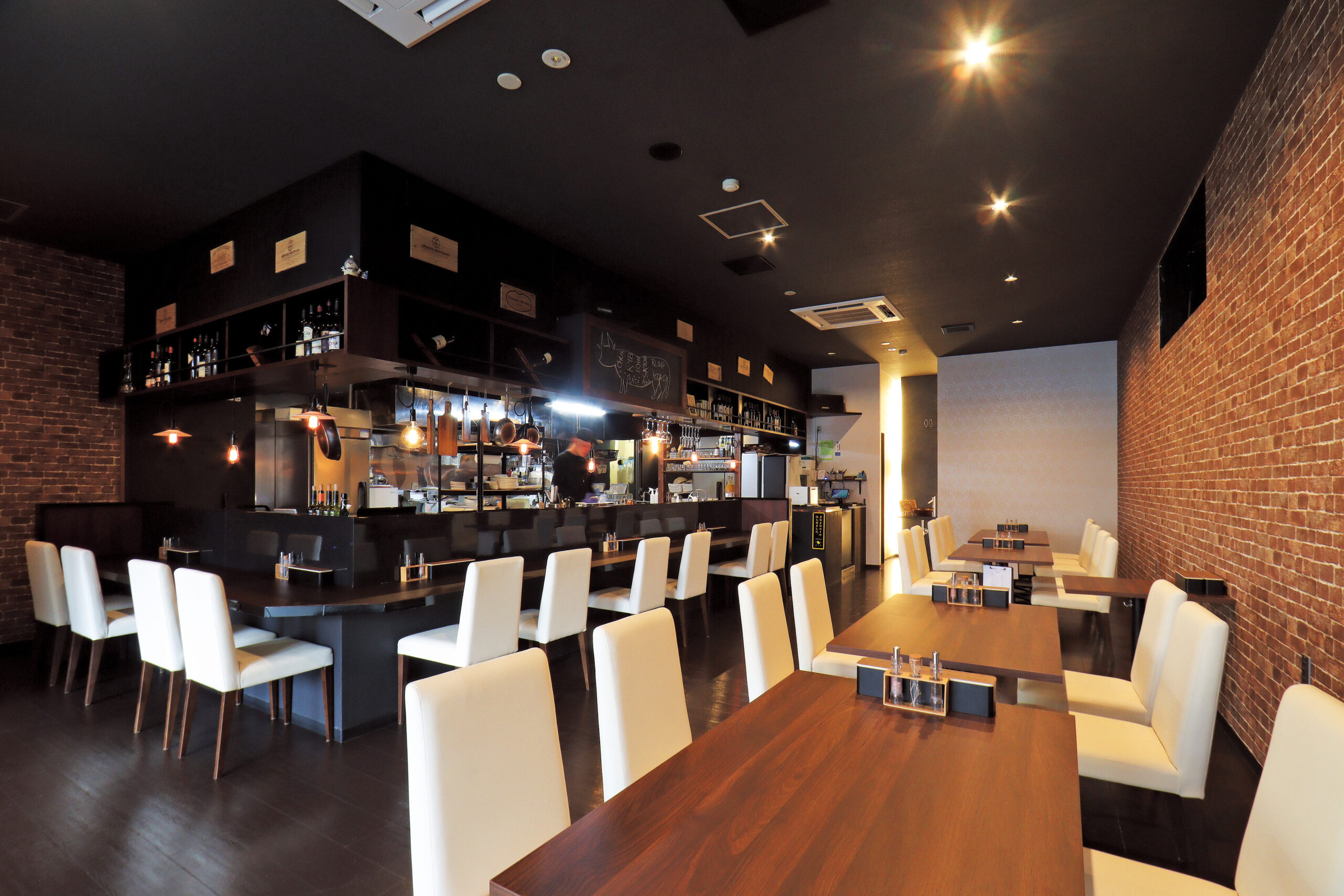 オープンキッチンのライブ感も魅力の店内。少人数からグループまで使い勝手が良い。