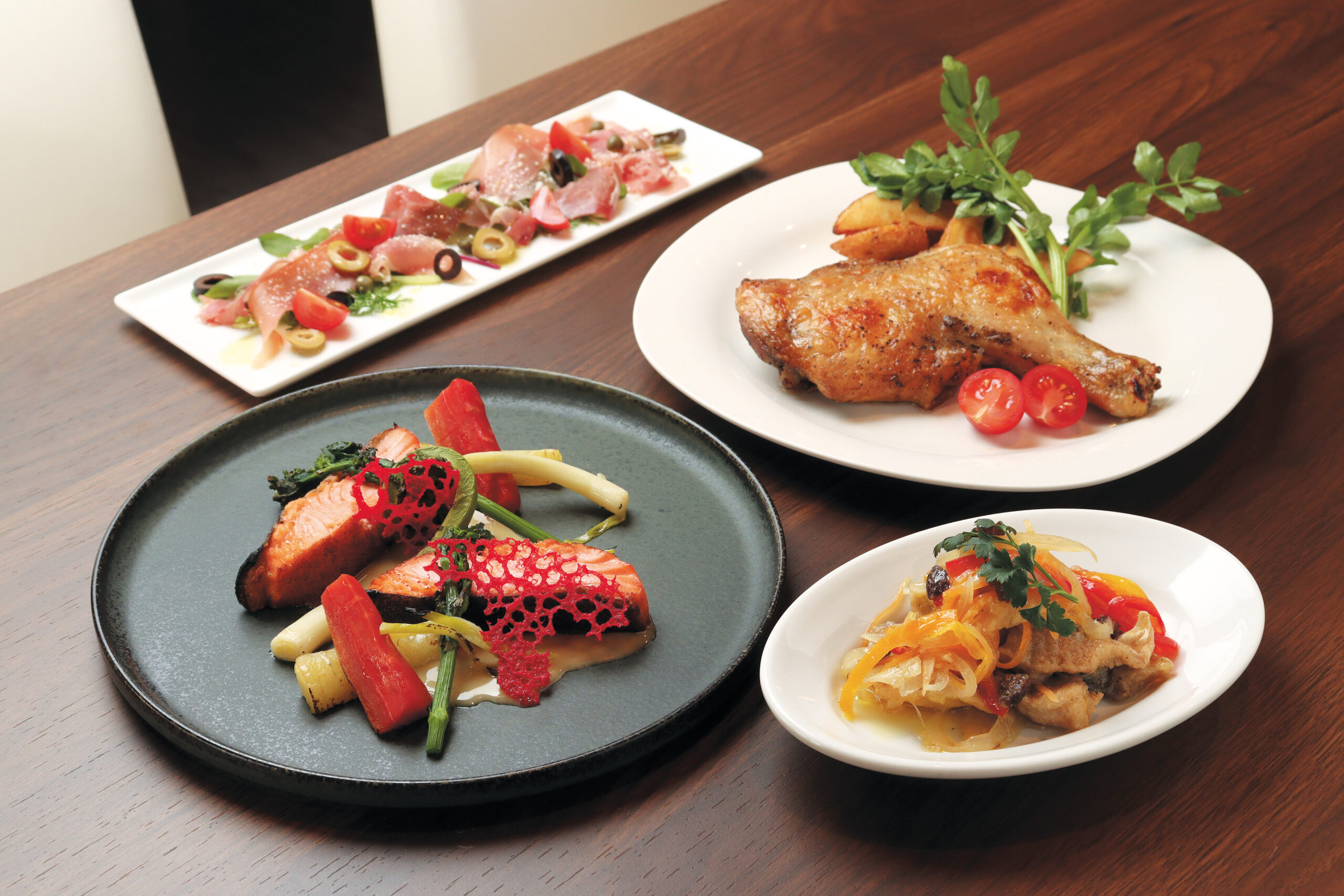 手前左から時計回りに、白ワインベースの香り良いソースを添えた「サーモンのポワレ ヴァンブランソース」1,430円、前菜にぴったりの「生ハム(ハモンセラーノ)」990円、香ばしく食べ応えのある「鶏骨付き肉のコンフィ」1,210円、揚げ魚をマリネした爽やかな「魚のエスカベッシュ」660円。