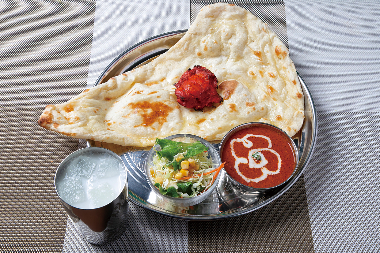(トップ)ランチセットの「Fセット」1,350円(カレー・チキンティッカ・プレーンナン・サラダ・ドリンク付き)。カレーは8種類から選べ、写真は豚肉がゴロゴロと入ったポークカレー。辛さも選べる。