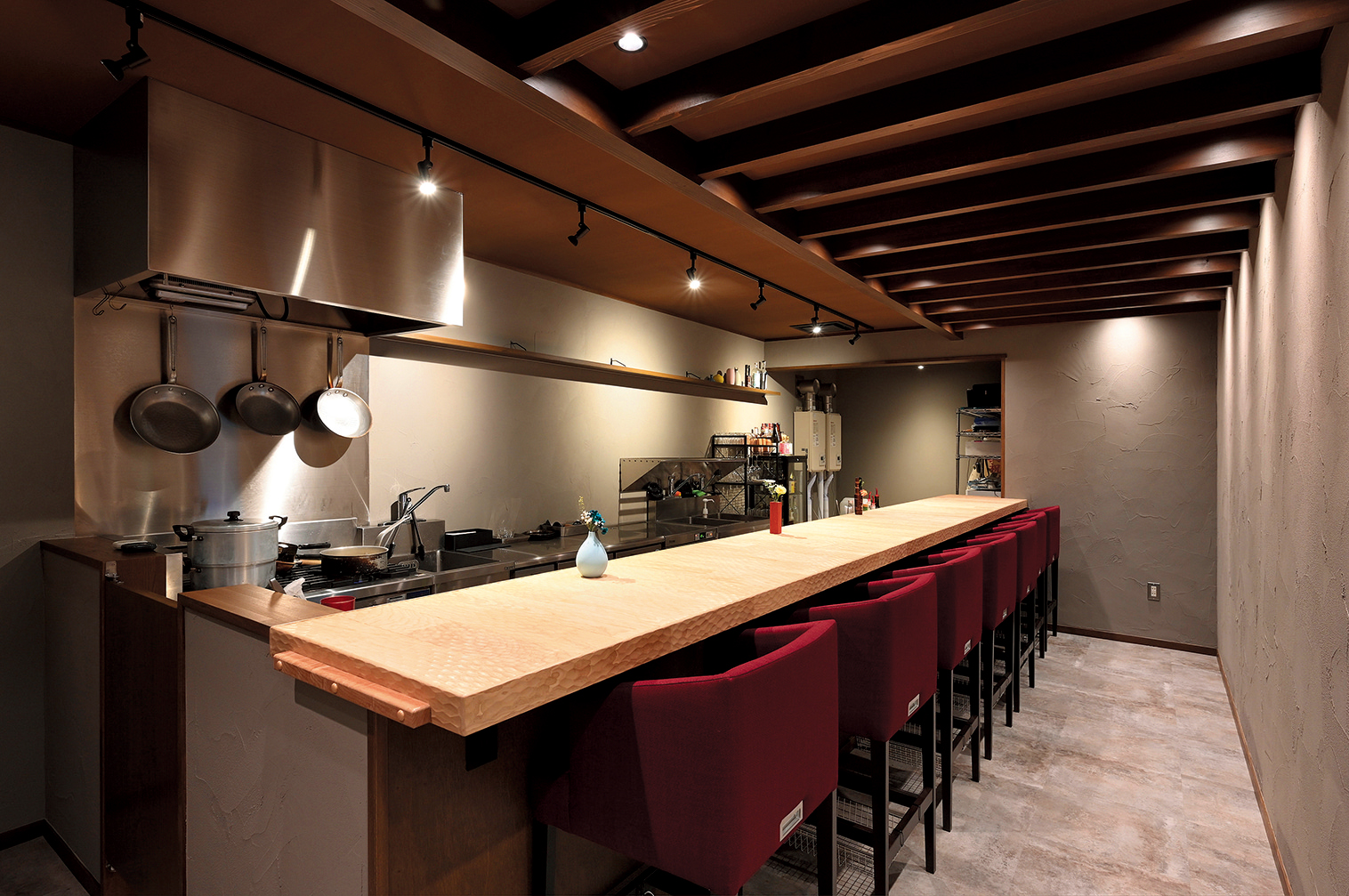 (トップ)秋田杉を使った天井や陰影が美しい塗り壁、クリの木のカウンターなど随所にこだわりが。