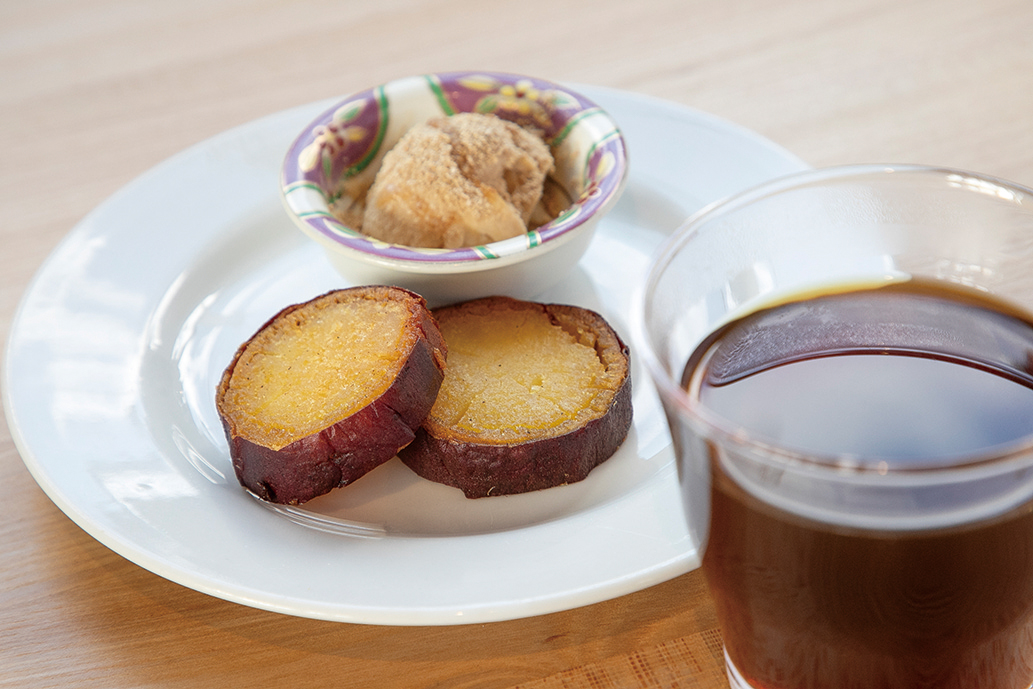 皮がカリカリ、中はとろとろ食感の芋が◎の「焼き芋とアイス」500円と、2種から選べる「コーヒー」600円。