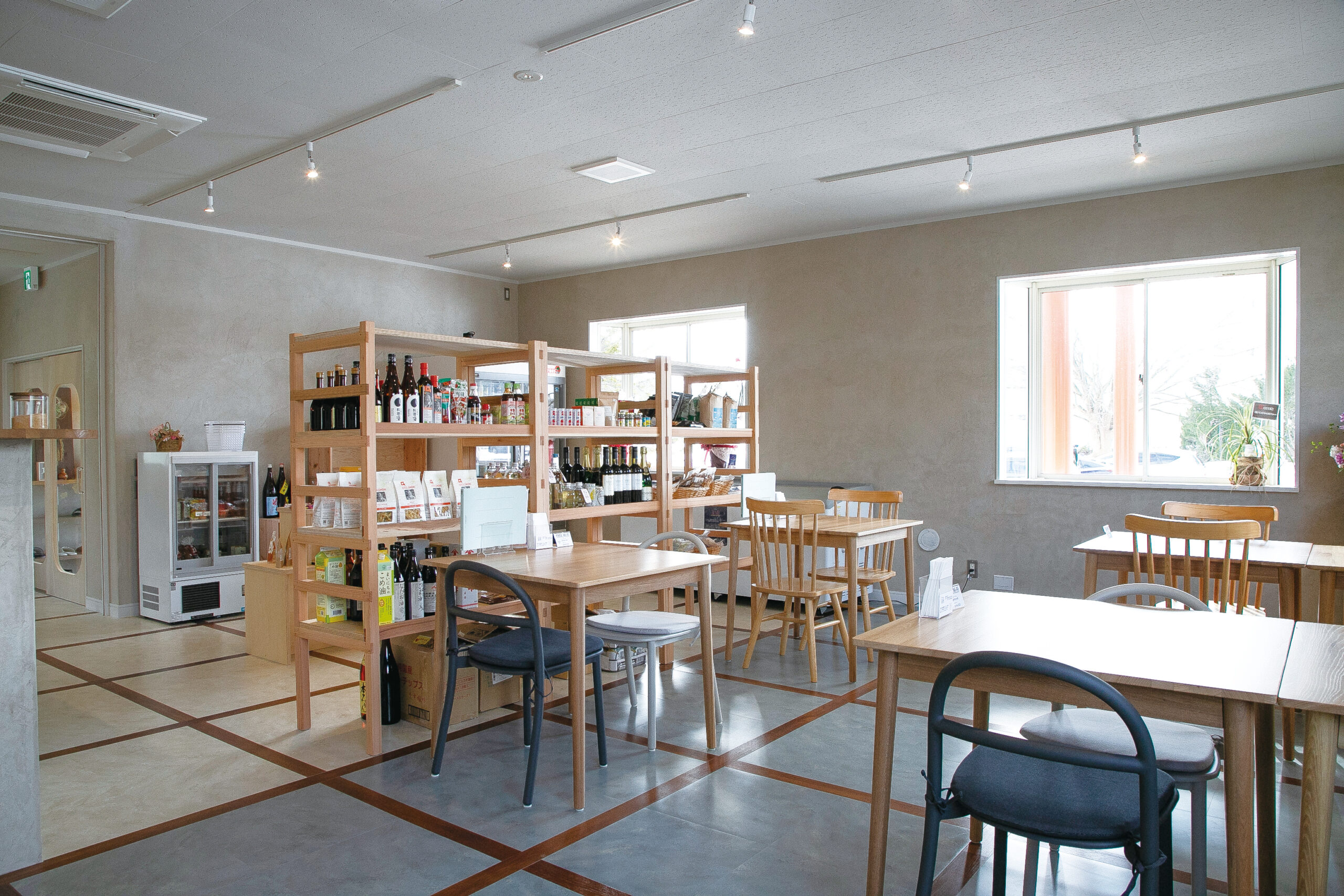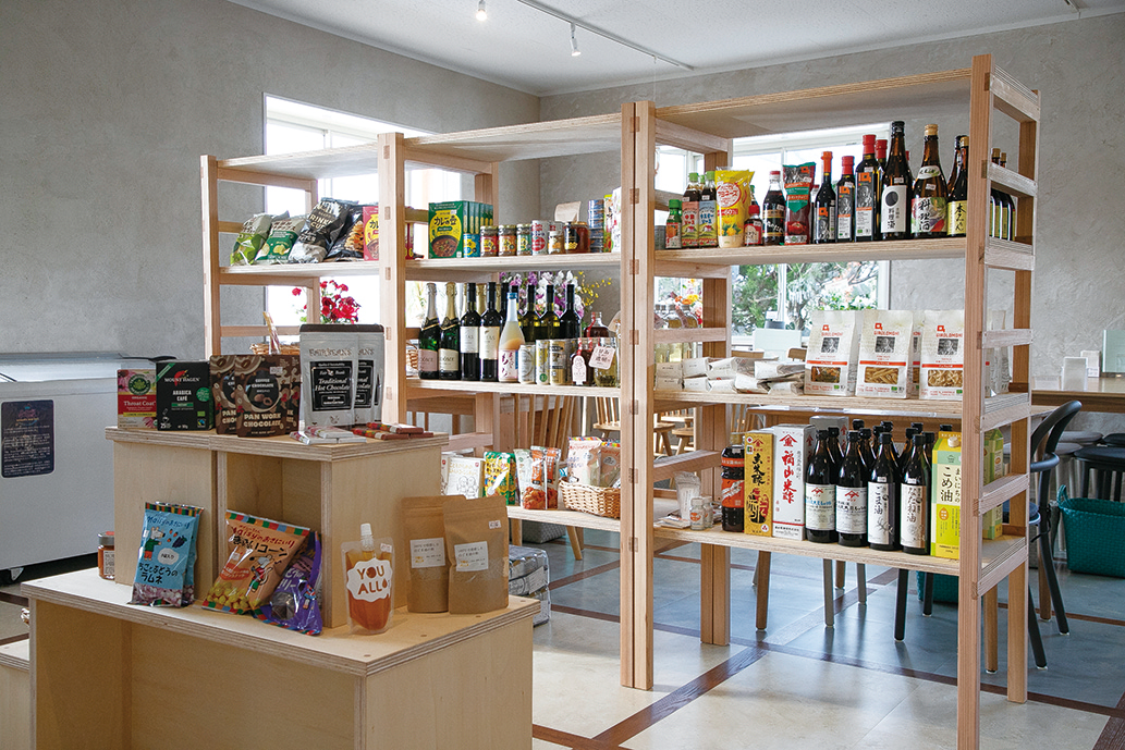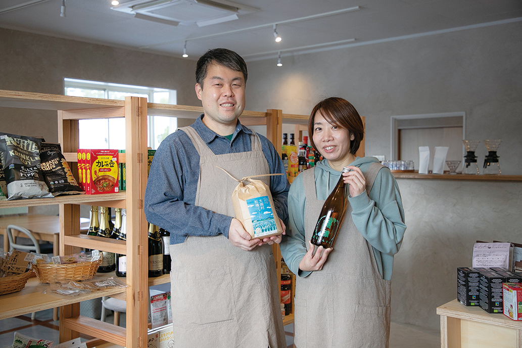 白鳥のアーケードが目印の大潟村商店街に昨年12月、「大潟村松橋ファーム」が運営する、カフェと小売店を備えたお店がオープン。「ponte」はイタリア語で「橋」を意味し、自身の名前と、「集う人の橋渡しができるように」という思いを込めた。壁に酒米の稲藁を混ぜたり、天板に田んぼの土を使ったり、随所に村の土の色をイメージした青色を用いたりと、大潟村らしさを大切にした店内。カフェでは、村の形に盛ったご飯が特徴的なカレーや、男鹿市「さとやまコーヒー」によるオリジナルの「干拓者ブレンド」などが味わえる。小売店は大仙市の「アキモト酒店」が担当し、松橋ファームの酒米で作る「農醸」などの日本酒や調味料、食品を揃える。