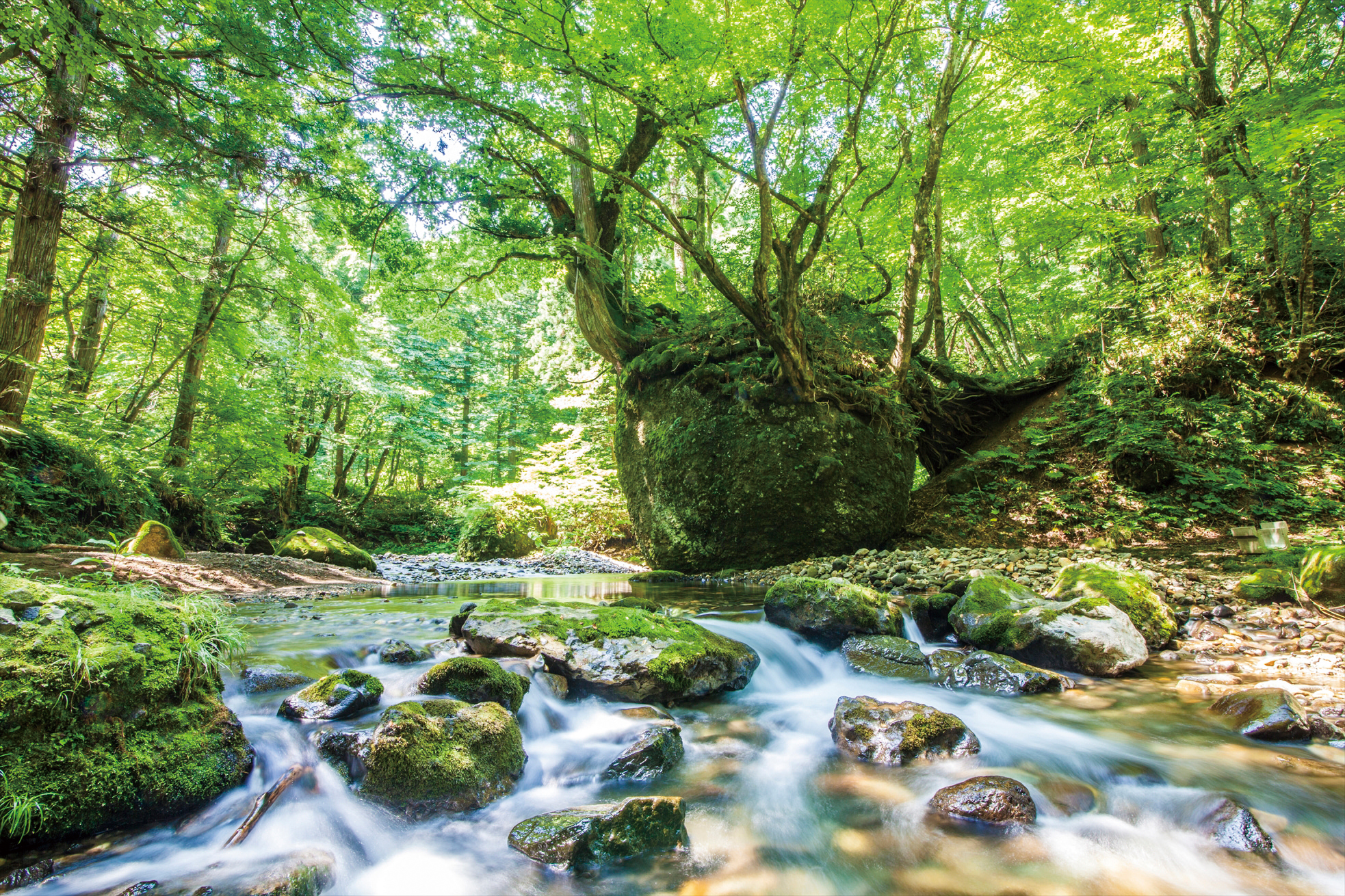 馬場目川の上流にひっそりと佇む、巨大な奇岩「ネコバリ岩」。高さ約6メートルの岩はコケに覆われ、その上には杉やブナ、カエデなどの木々が根を張っています。清流のせせらぎと調和した不思議で神秘的な風景が広がり、訪れる人に生命の力強さを感じさせるパワースポットです。