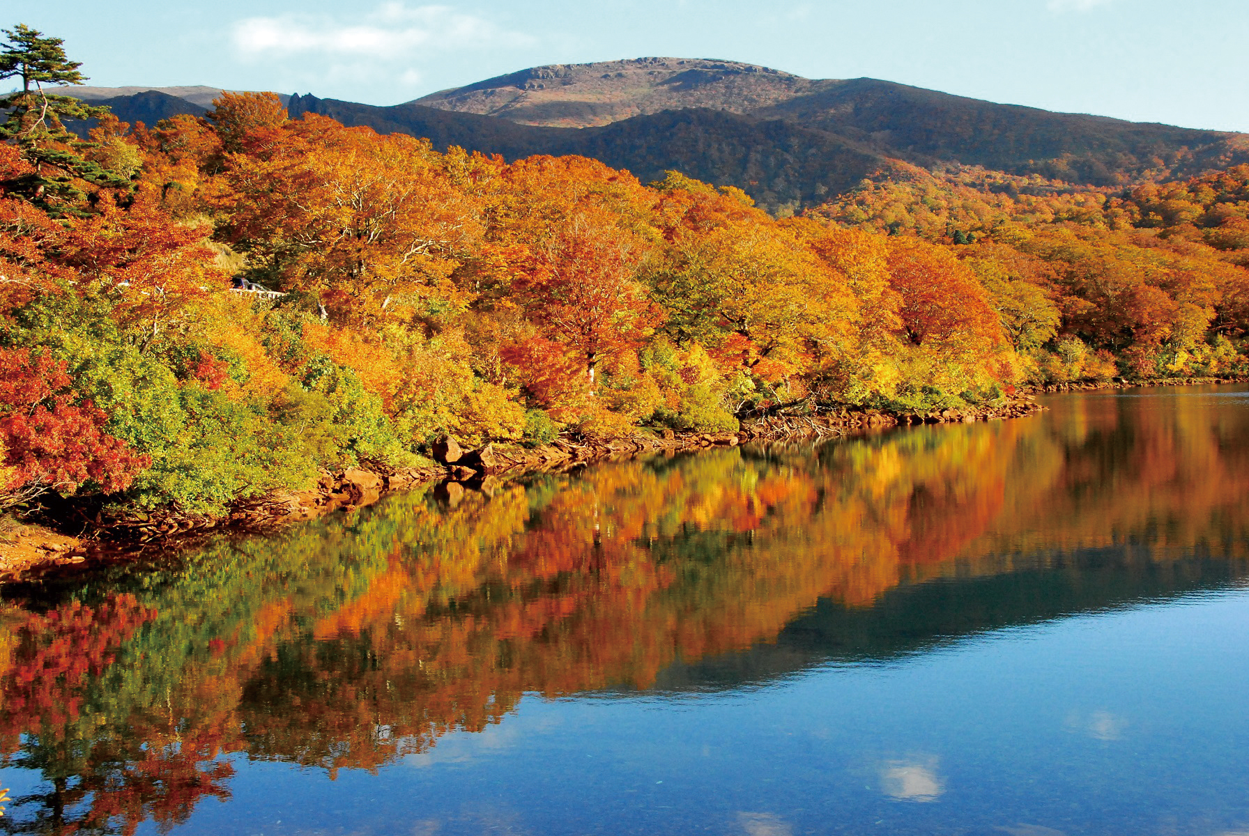 周囲をブナ林に覆われた、別名・朱沼と呼ばれる須川湖。ブナやカエデ、ナナカマドなどの黄色や赤、キタゴヨウマツの緑のコントラストが見頃を迎え、それを映す美しい湖面を眺められます。須川高原を散策したら、ぜひ栗駒山荘へ。紅葉を見晴らす露天風呂で疲れを癒やしましょう。