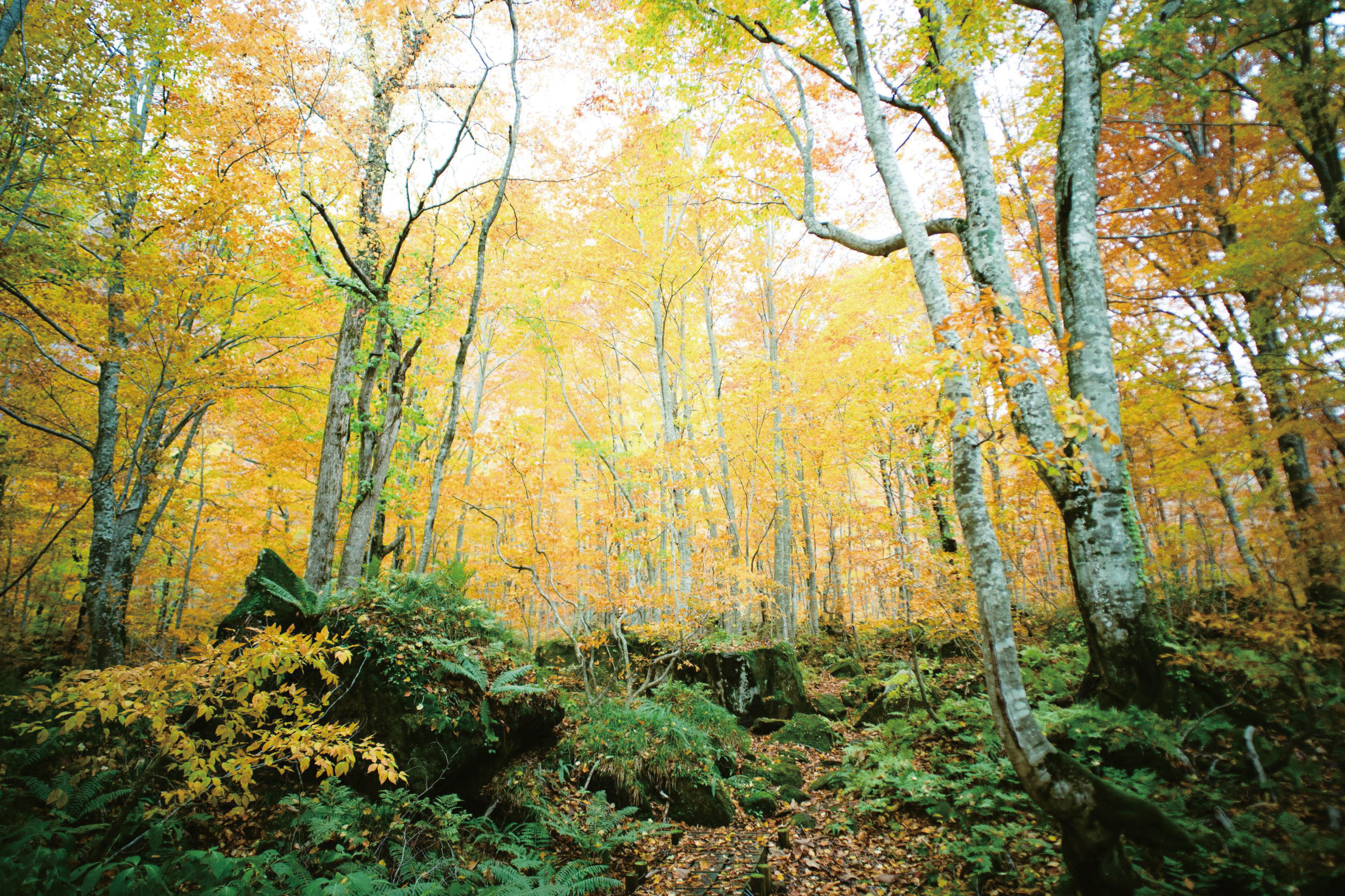 岳岱自然観察教育林は、白神山地の奥山に残る原生的なブナ林です。紅葉の見頃は10月下旬から11月上旬で、森一帯が黄色に色づき、秋ならではの美しい景色を楽しめます。かつてのシンボルツリー「400年ブナ」の倒れた姿や新たな「岳岱大ブナ」の雄大な姿をぜひ見に来てください。