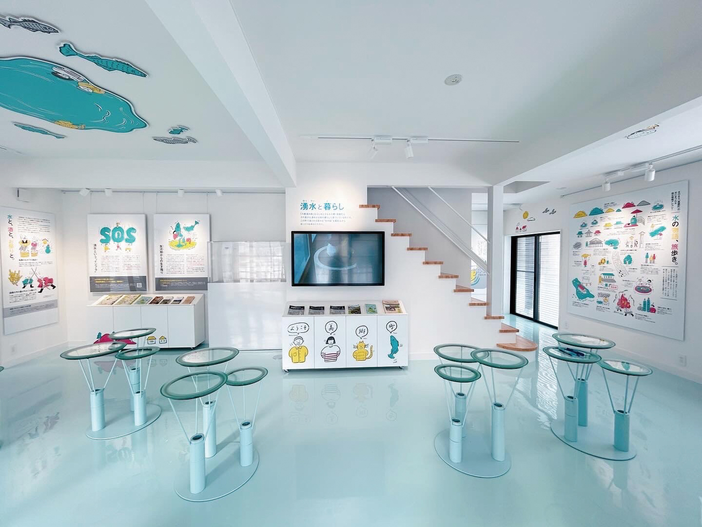 六郷湧水群のエリアの中心に位置する「清水の学習・案内所 水の休み場」。1Fは湧水散策時の休憩&清水についての展示スペース、2Fは湧水をイメージした幻想的な空間「水色の部屋」になっています。秋には施設敷地内の樹木が鮮やかに色付き、湧水と紅葉を同時に楽しめますよ。