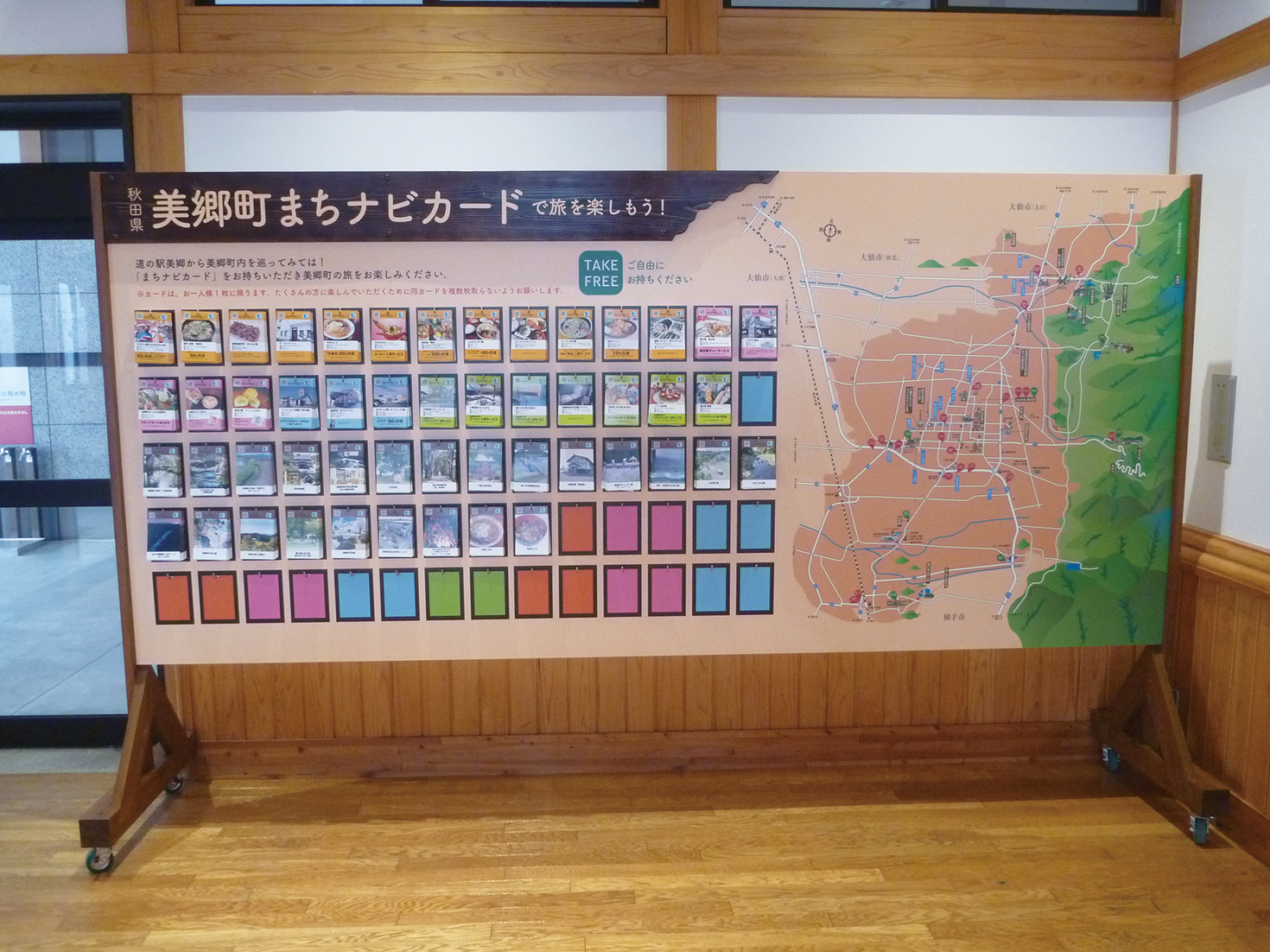 道の駅美郷内の観光情報センターには、美郷町のさまざまな飲食店や土産店、観光スポットなどを紹介する「美郷町まちナビカード」を掲示しています。お得な割引や特典が記載されているカードもあるので、町内のお店や観光スポット巡りに活用してみてはいかがでしょうか。