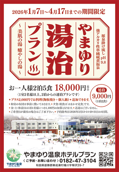 | 料金 | 2泊5食18,000円 ※金曜・土曜・祝前日は1泊1名につきプラス1,100 円 |