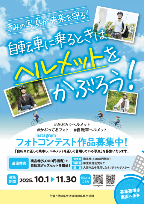 現在、秋田県では「自転車用ヘルメット、ちゃんと似合ってる?」をテーマに、「#かぶろうヘルメット フォトコンテスト2025」を開催中です。自転車に正しく乗車し、ヘルメットを正しく着用している写真を撮り、指定ハッシュタグ「#かぶろうヘルメット」を付けて、Instagramに投稿してください。入賞作品には、商品券や自転車グッズなどが贈呈されます。