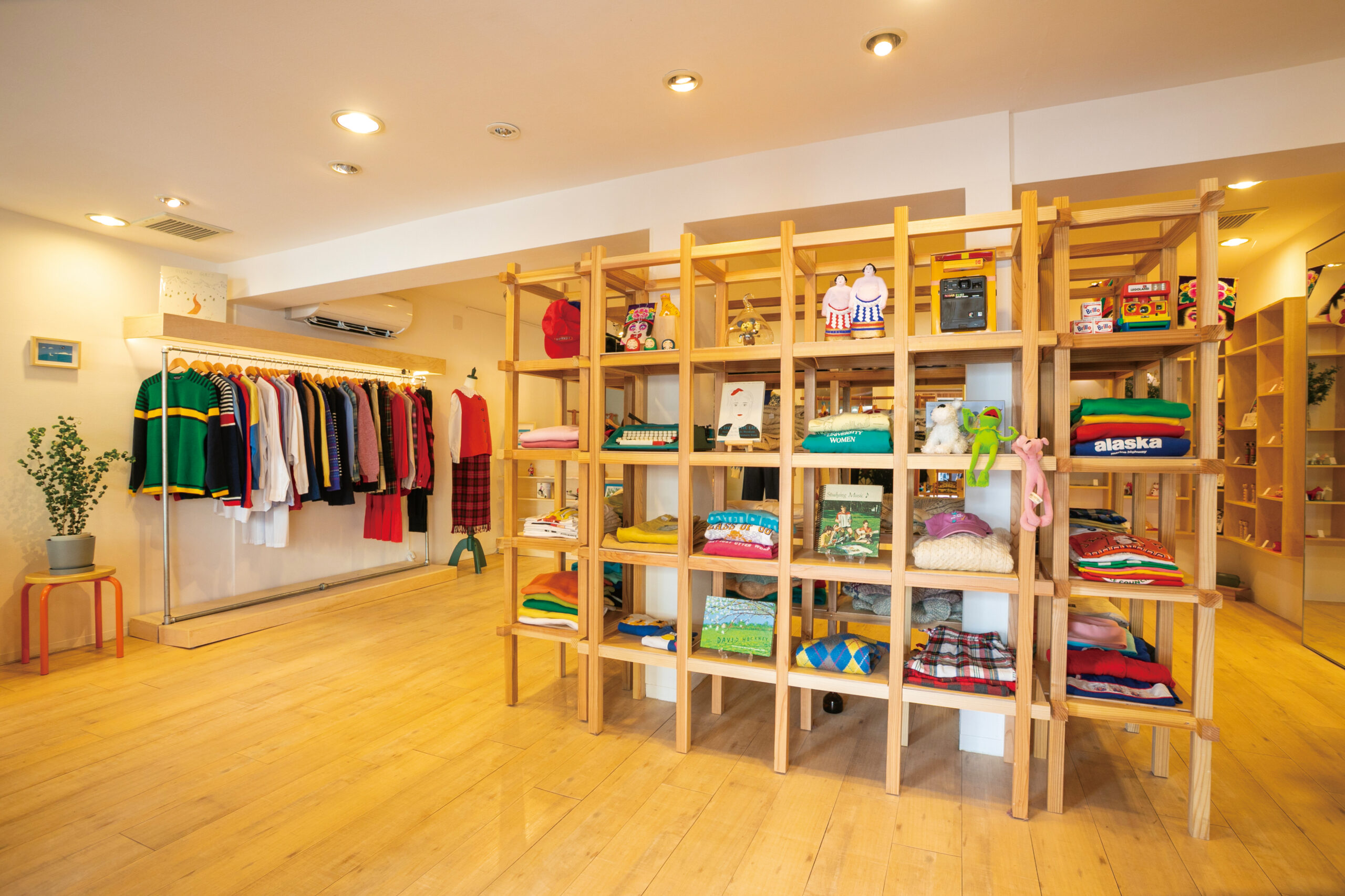 (トップ)木を基調とした可愛らしい店内。手持ちの服に合わせやすい古着が3,000円台〜と手頃な価格で揃う。今の時期はほっこりとしたニットが充実。