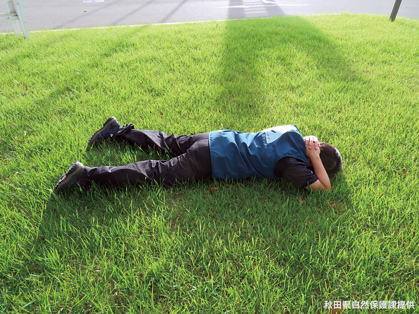 クマに襲われそうな場合は、両手を首の後ろで組んで顔を伏せる防御姿勢をとってください。クマの攻撃は頭部に集中します。頭部や頸部への致命傷や顔面への大怪我を防ぐため、首から上を守りましょう。
