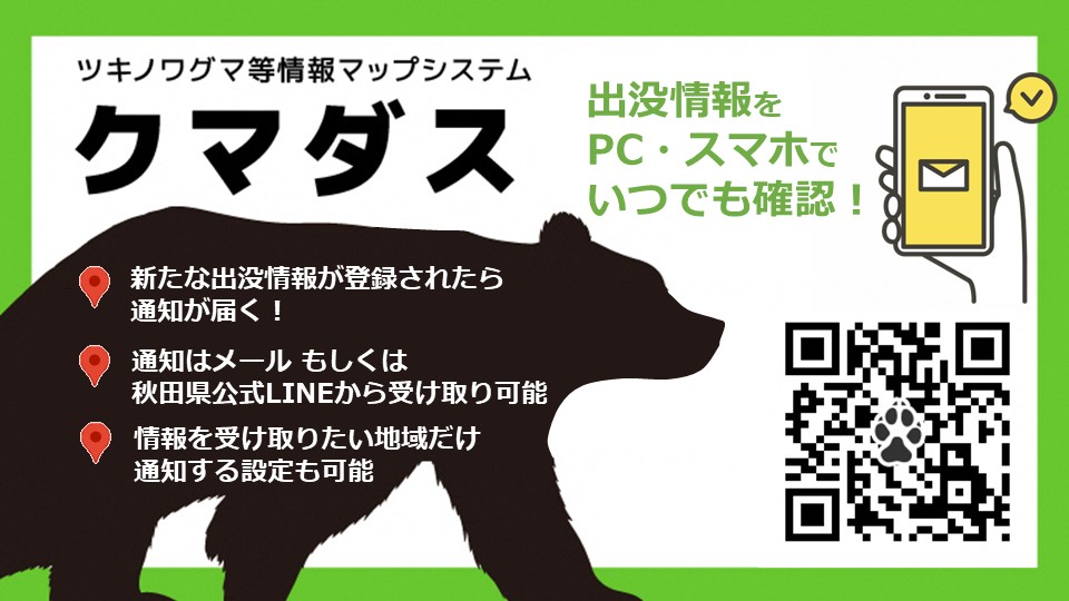 また、情報の収集・共有も大切です。地域でクマを目撃したら、近所の人と「さっきそこに出たよ」と情報共有して、お互いに注意し合いましょう。出没情報は、県の情報マップシステム「クマダス」でも確認することができます。