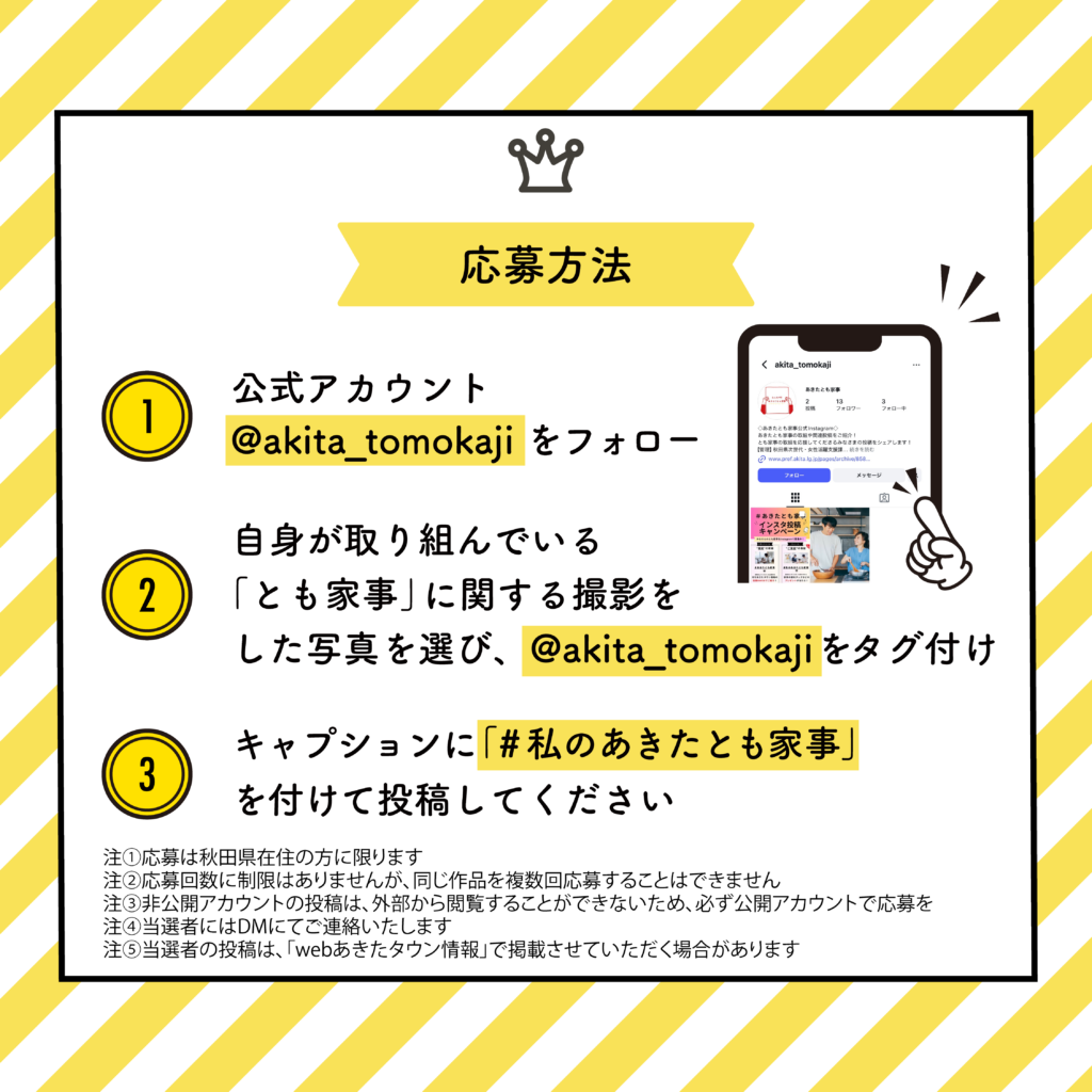 3.キャプション等にハッシュタグ(#私のあきたとも家事)を付けてInstagramに投稿し、(@akita_tomokaji)をタグ付け