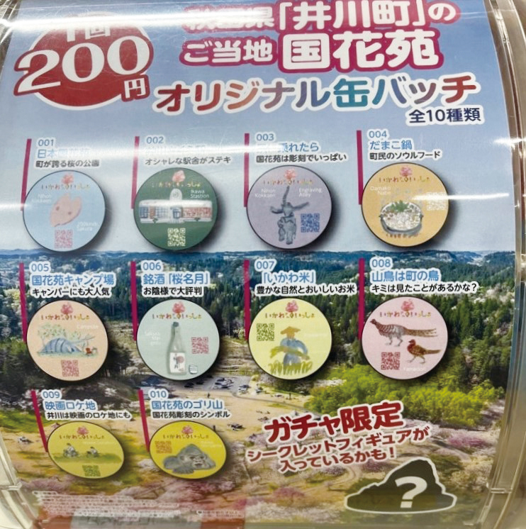 井川町のご当地ガチャをご存じですか? 町をモチーフにした可愛いデザインの缶バッチが入手できます。まれに、日本国花苑の彫刻を再現したシークレット立体フィギュアが出ることも。ガチャは町が主催するイベントなどに設置されますので、見かけたらぜひ回してみてください!