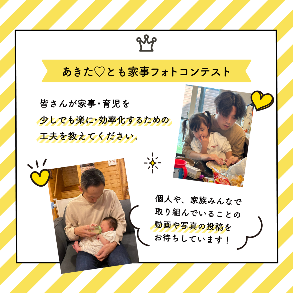 秋田県では、「あきた♡とも家事」公式SNSの運用を始めました。社員の家庭での「とも家事」を応援・推進する企業を募集中。企業で「とも家事」の応援・推進に取り組む動画や写真をInstagramに投稿してください。素敵な投稿をしてくれた企業の中から、いいねの数やユーザーの反応をもとに選定し、月刊誌「あきたタウン情報」3月号・4月号内でもその取り組みをご紹介します!
