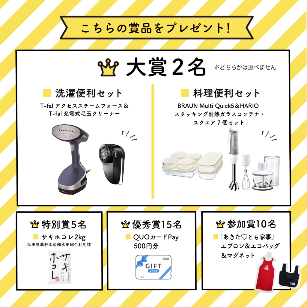 投稿いただいた方の中から抽選で、日常の家事を助けるグッズやアイテムなどのプレゼントが当たりますよ♪