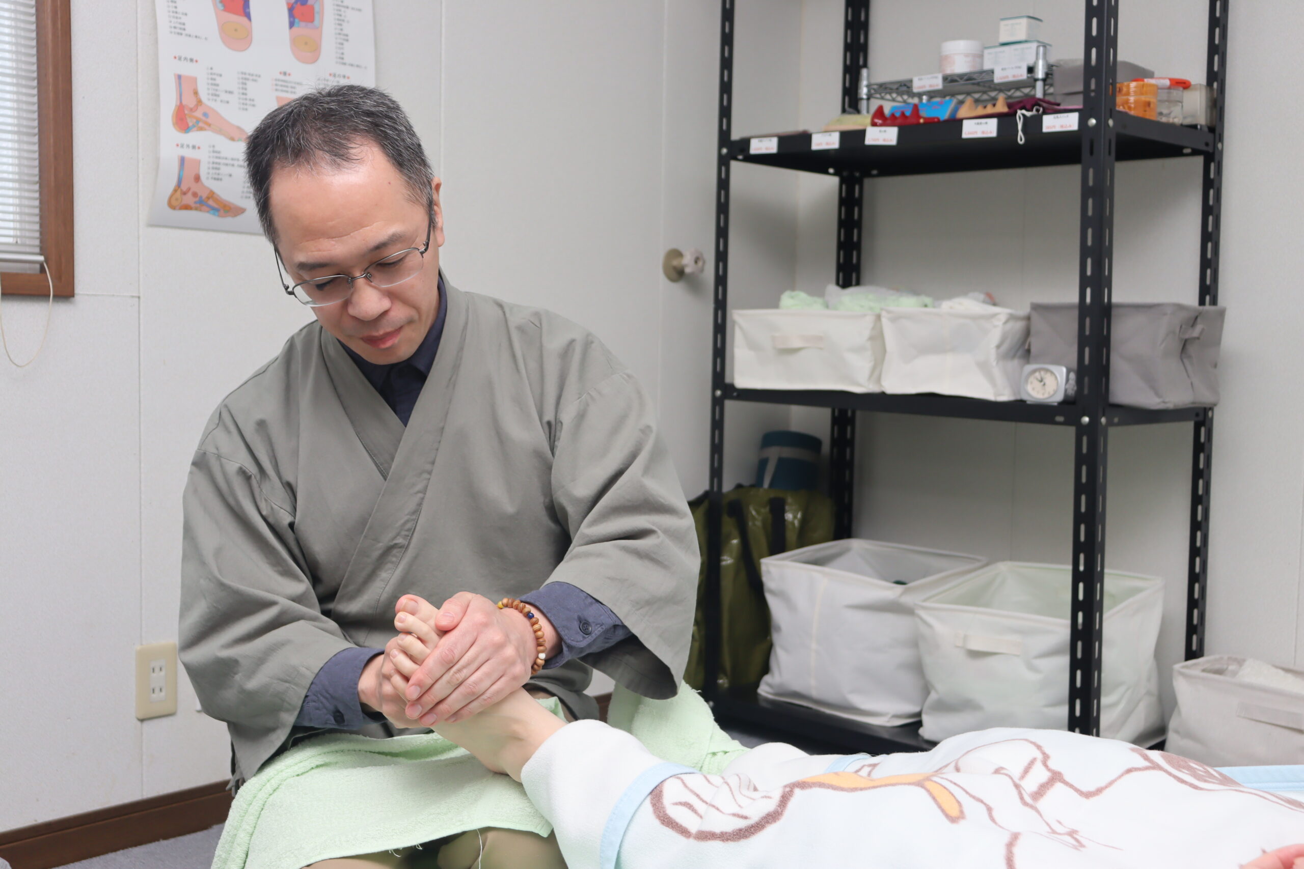 若石式足もみは、足部にある64カ所の反射区を刺激する施術。血液循環を促進させ、健康維持や体質改善を図る。