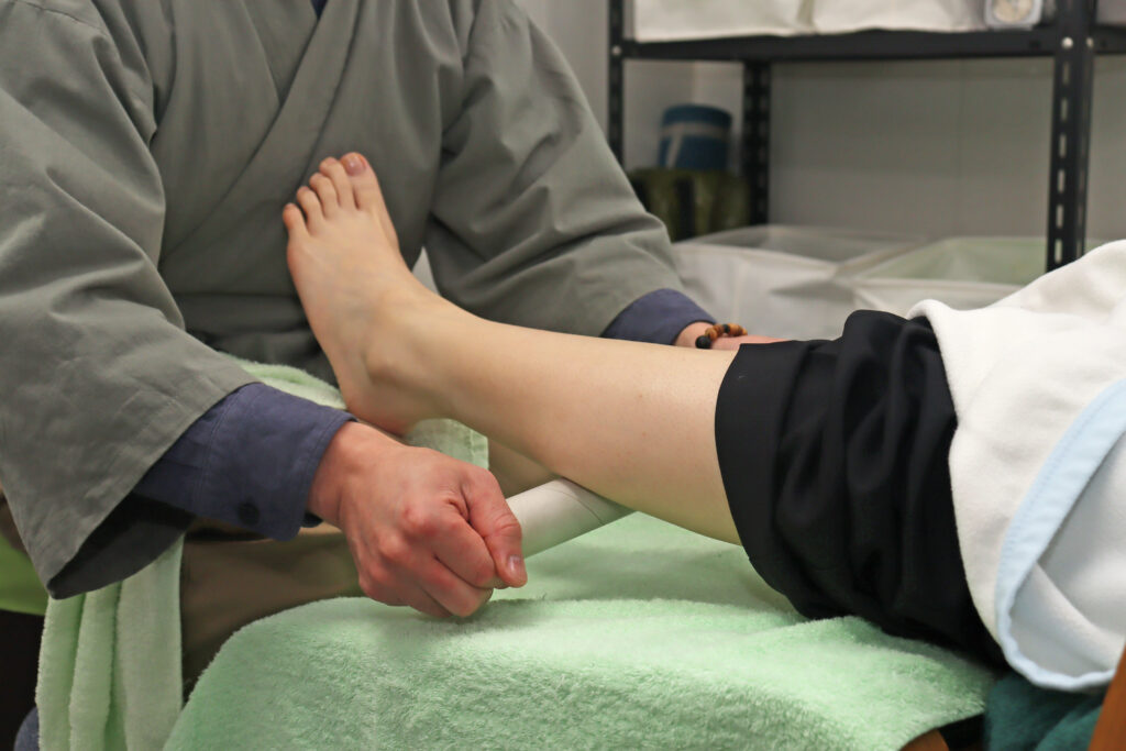 足圧整体は、主に大腿部やふくらはぎを足で踏むことにより、血液循環を促進させて筋肉をほぐす施術(上半身を行う時は、場所によって手や肘を使って施術)。