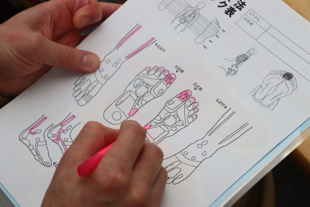 施術後は身体の状態を見た上で、気になった点や、日常で気をつけるべきことなどを丁寧に教えてもらえる。反射区図表ももらえるのでわかりやすい◎。